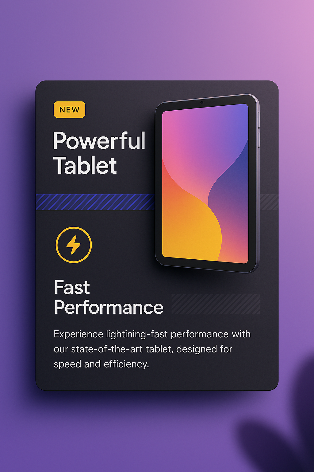 /Collection: /by davooda/Type: PNG/A visually striking 3D illustration of a tablet, integrated with a dark panel featuring bold text and vibrant colors. The design emphasizes performance and innovation.
