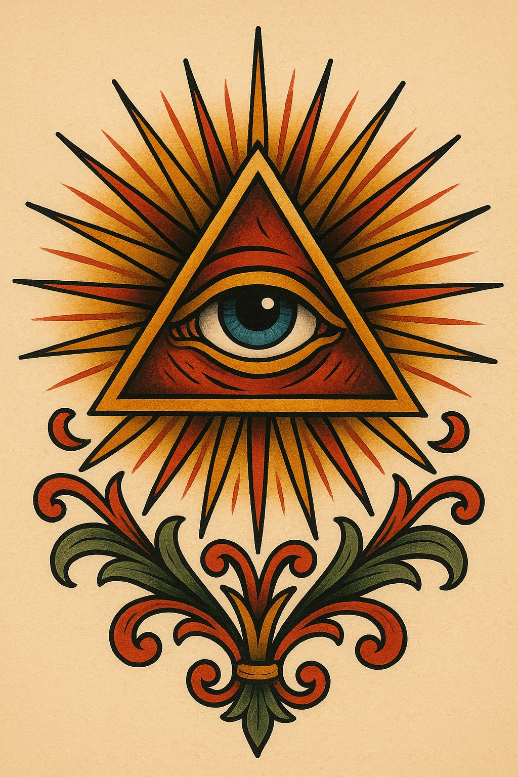 /Collection: /by davooda/Type: PNG/This graphic features a stylized Eye of Providence within a triangle, surrounded by a sunburst design and ornate floral elements. It's suitable for art prints or tattoo designs.