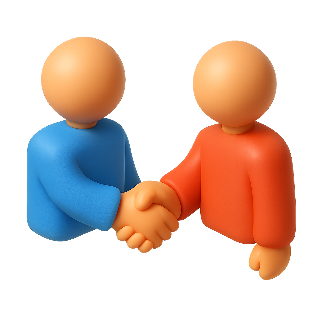 A vibrant 3D icon featuring two stylized figures in blue and red shaking hands. The design emphasizes a friendly and cooperative gesture, presented in an isometric, volumetric style with a transparent background.