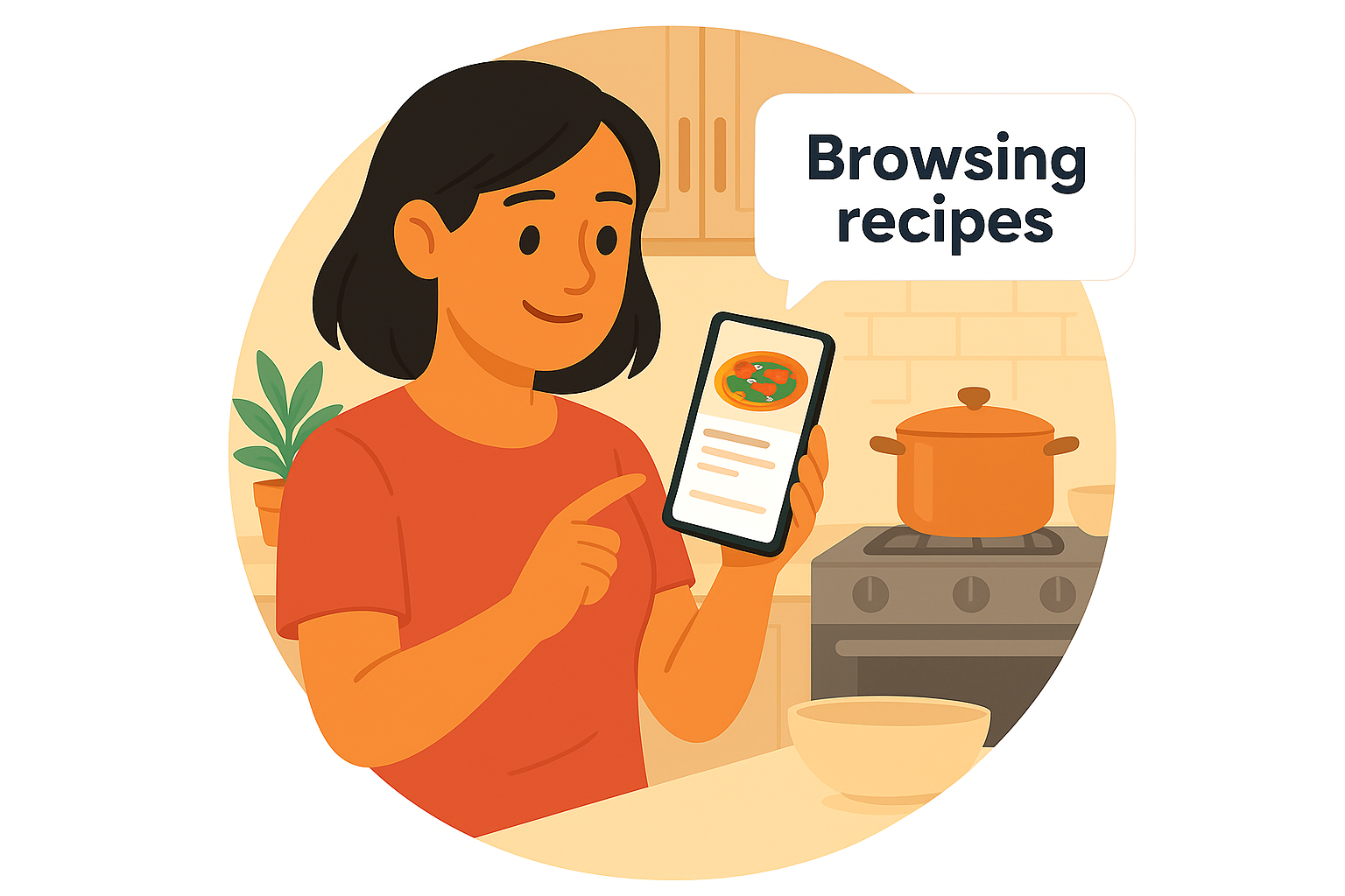 /Collection: /by davooda/Type: PNG/A vibrant illustration featuring a person engaged in browsing recipes on a smartphone. The cozy kitchen setting enhances the theme of cooking and meal preparation, suitable for culinary blogs or food apps.