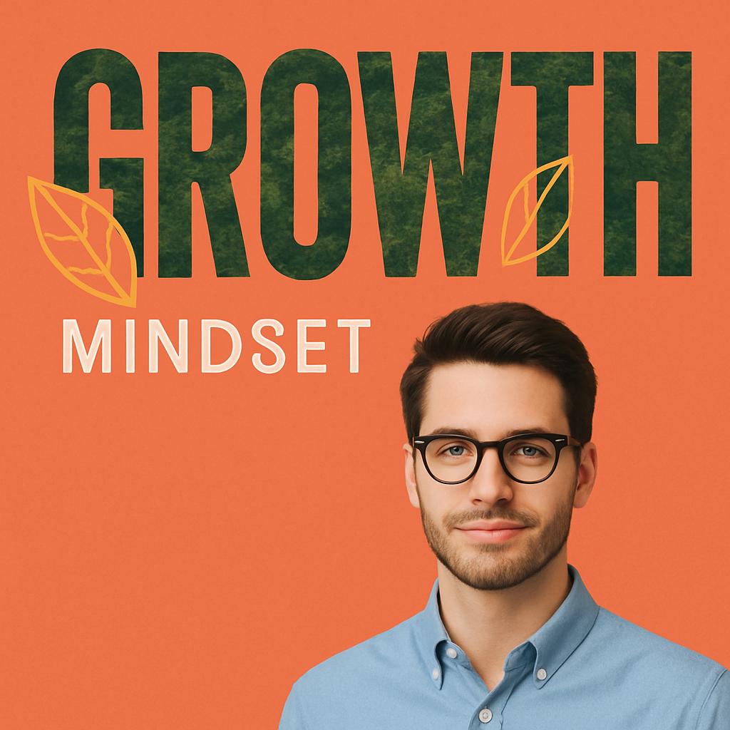 A visually engaging promotional image featuring a young man with glasses, emphasizing the concept of 'Growth Mindset' with bold typography and an orange background, suitable for educational or motivational content.
