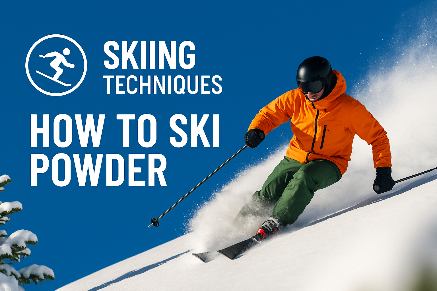 Informative graphic showcasing skiing techniques with an emphasis on powder skiing. The design features a skier in action against a bright blue sky, ideal for ski instruction or promotional content.