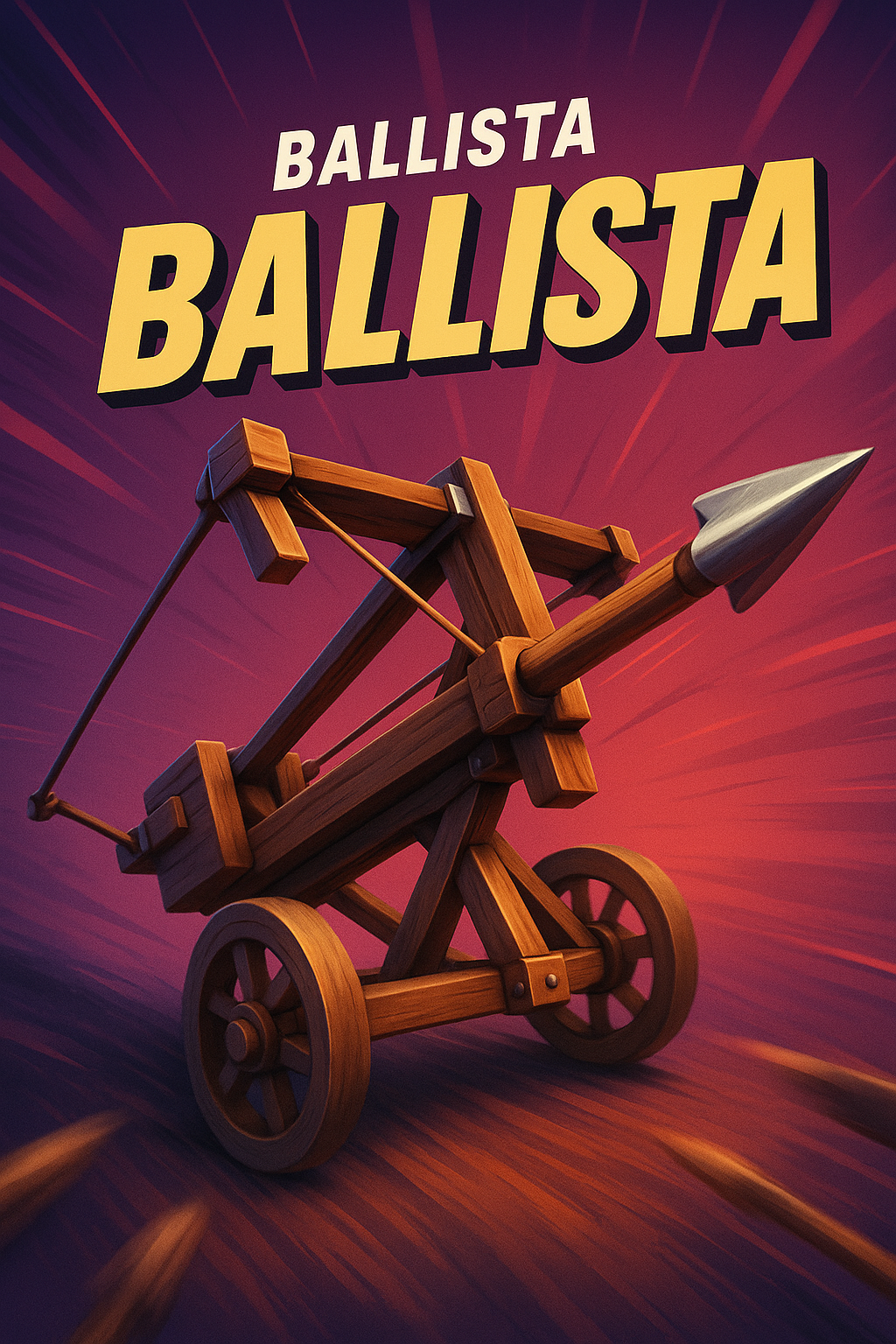 A visually striking 3D illustration of a ballista, featuring bold typography and vibrant colors. The dynamic angles and layered composition create an engaging aesthetic.