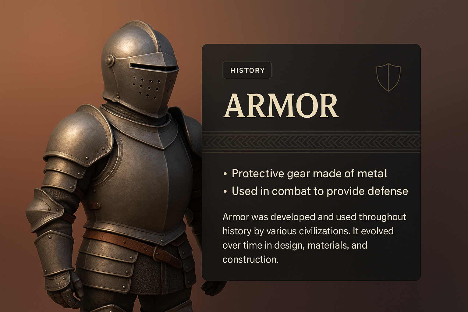 /Collection: /by davooda/Type: PNG/A detailed 3D illustration of a knight in armor, featuring a cohesive dark block with text and visuals. The background transitions smoothly, enhancing the overall aesthetic.