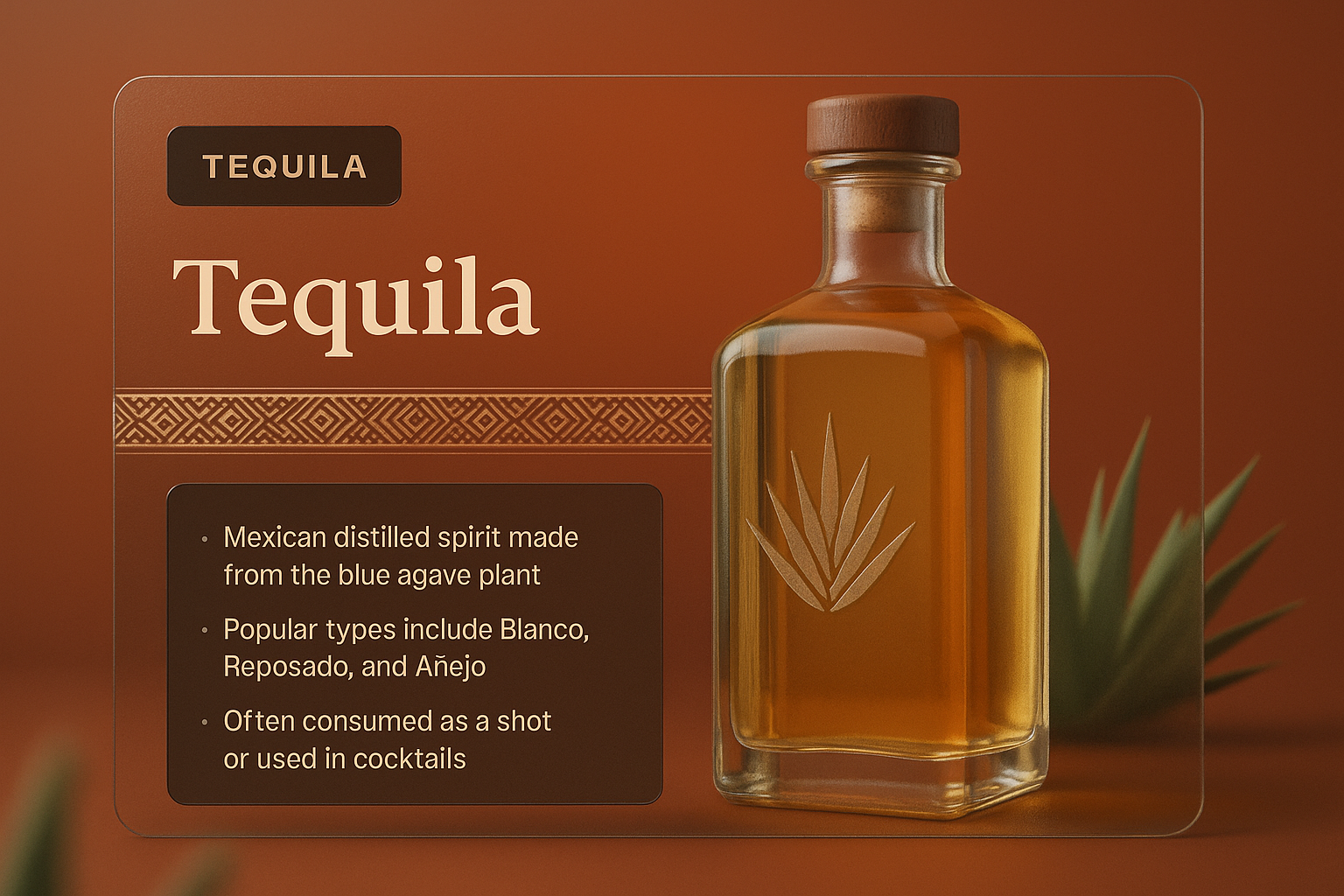 /Collection: /by davooda/Type: PNG/A visually appealing 3D illustration of a tequila bottle with an informative overlay. The dark panel features details about tequila types and its consumption.