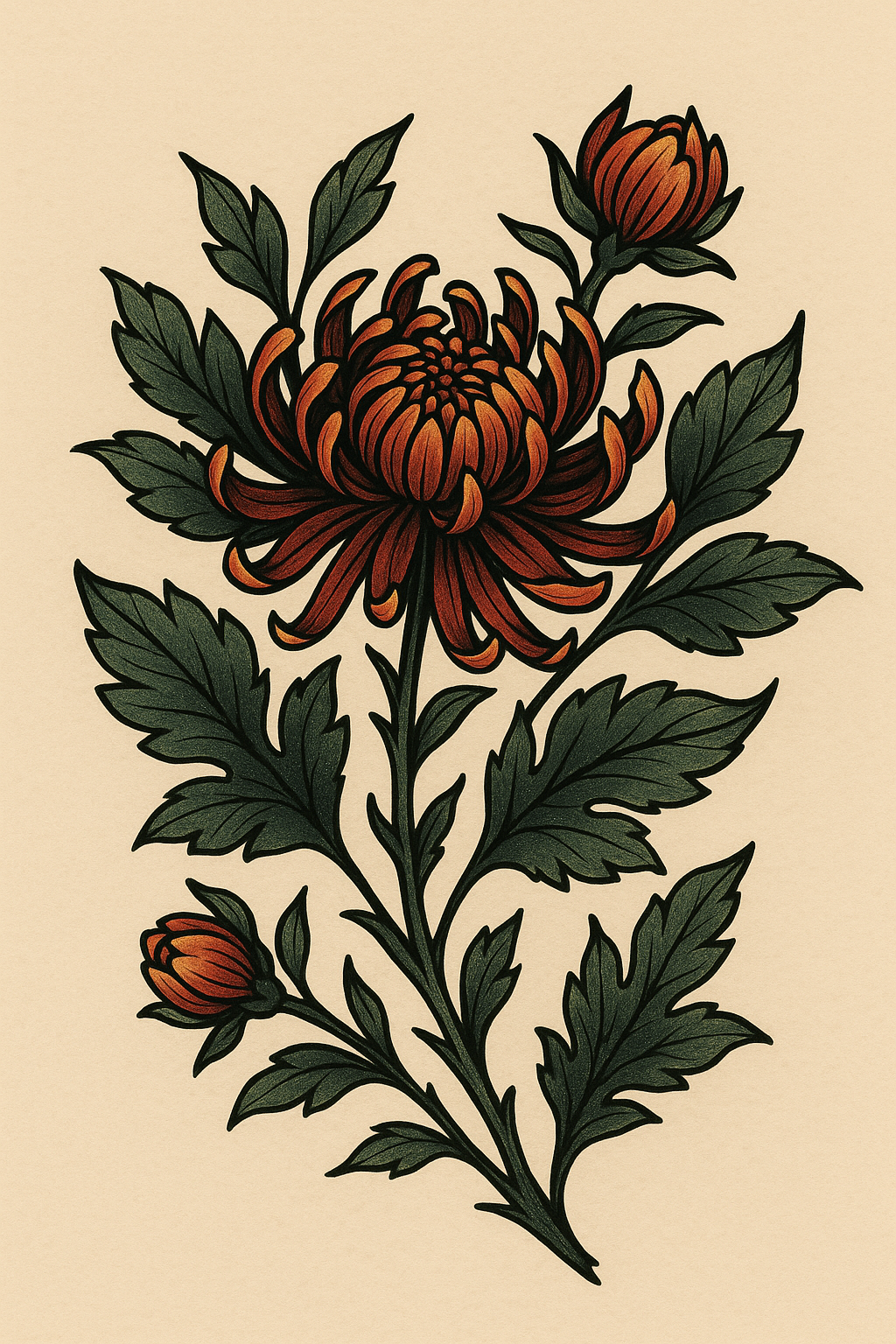 A detailed illustration of a chrysanthemum flower and buds, featuring bold colors and intricate line work. Suitable for art prints or botanical design.