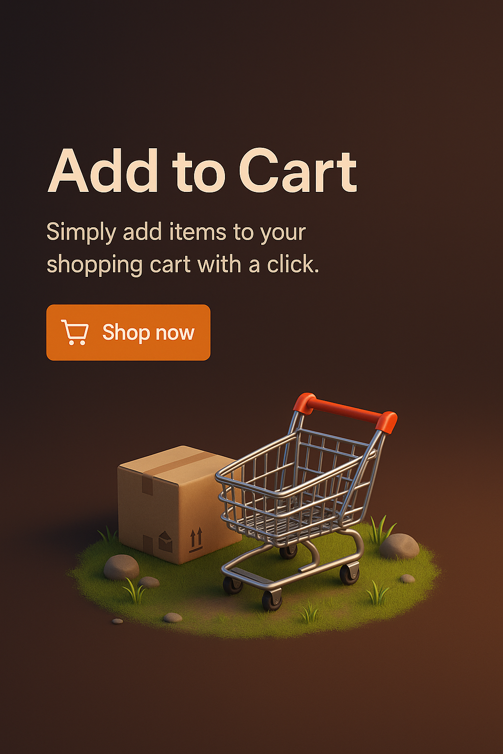 /Collection: /by davooda/Type: PNG/A detailed 3D illustration featuring a shopping cart and a cardboard box on a grassy patch. The dark gradient background enhances the vibrant colors of the scene.