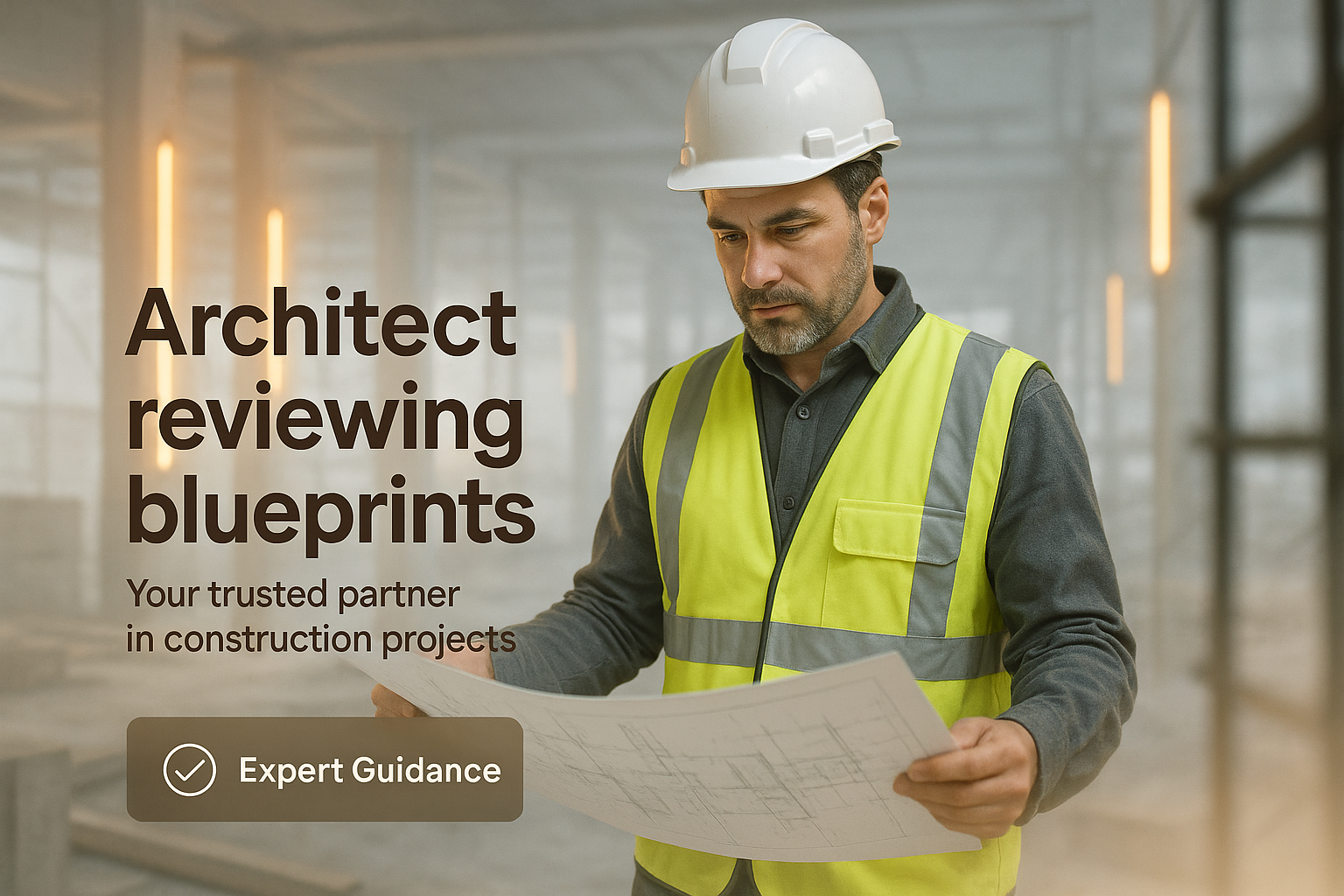 Construction Professional Reviewing Blueprints in Modern Workspace