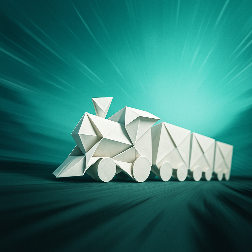 A dynamic illustration of a paper origami train, featuring various emotional words on its folds, set against a smooth gradient background. The scene captures movement with lines radiating from the center.