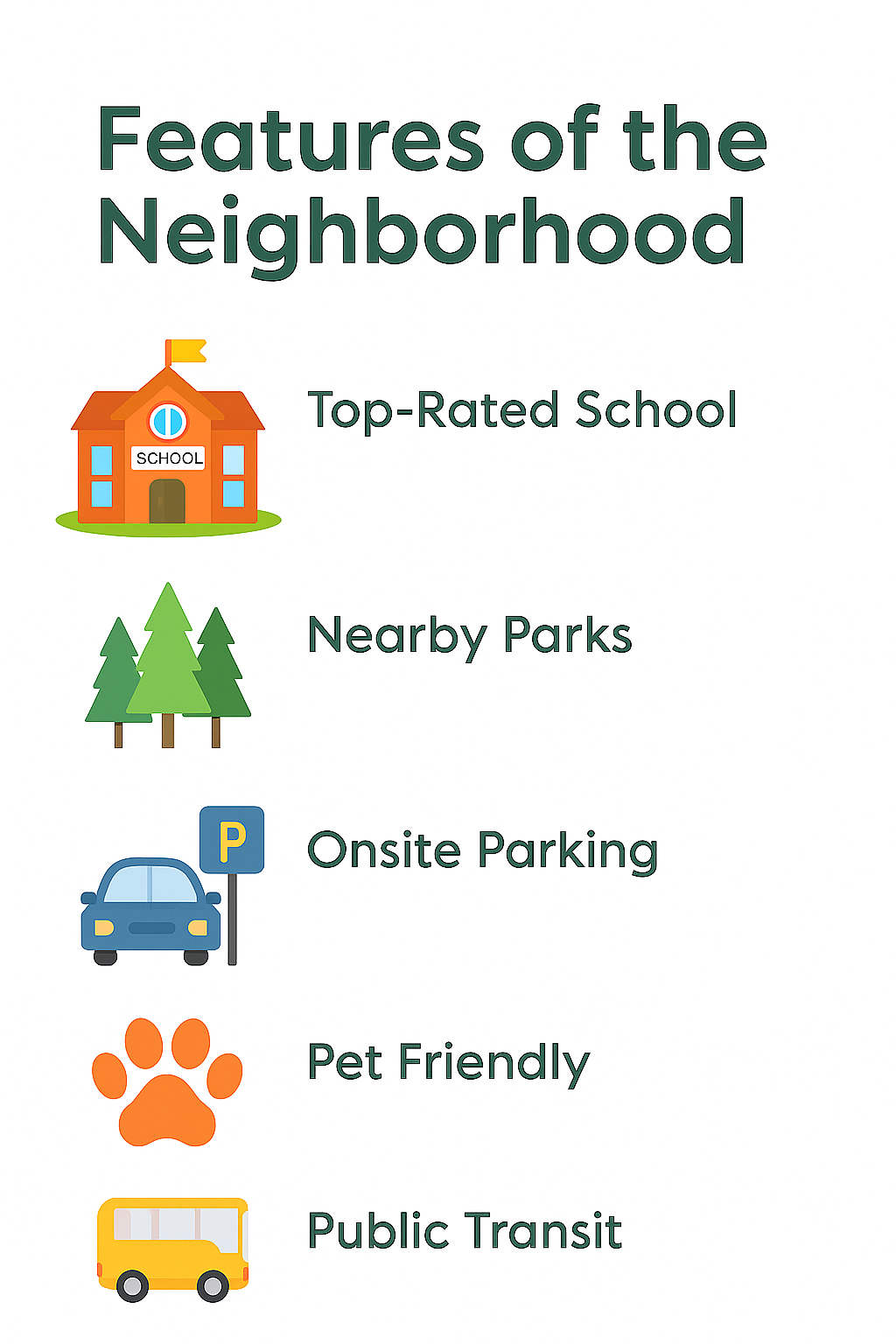 Neighborhood Features Infographic with Icons and Text