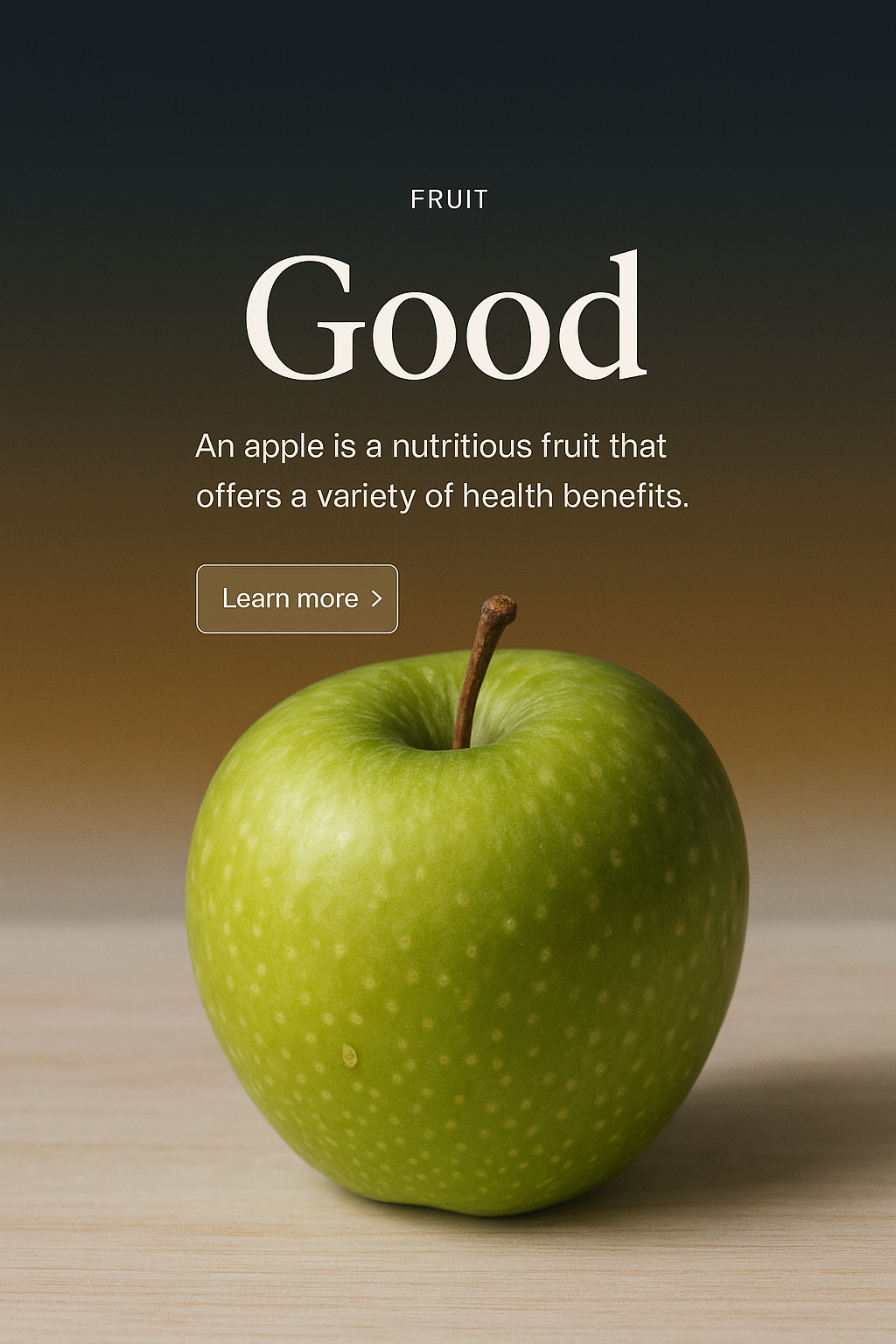 A stylish web design featuring a green apple, highlighting health benefits. The layout includes a bold label, a brief description, and a call-to-action button.