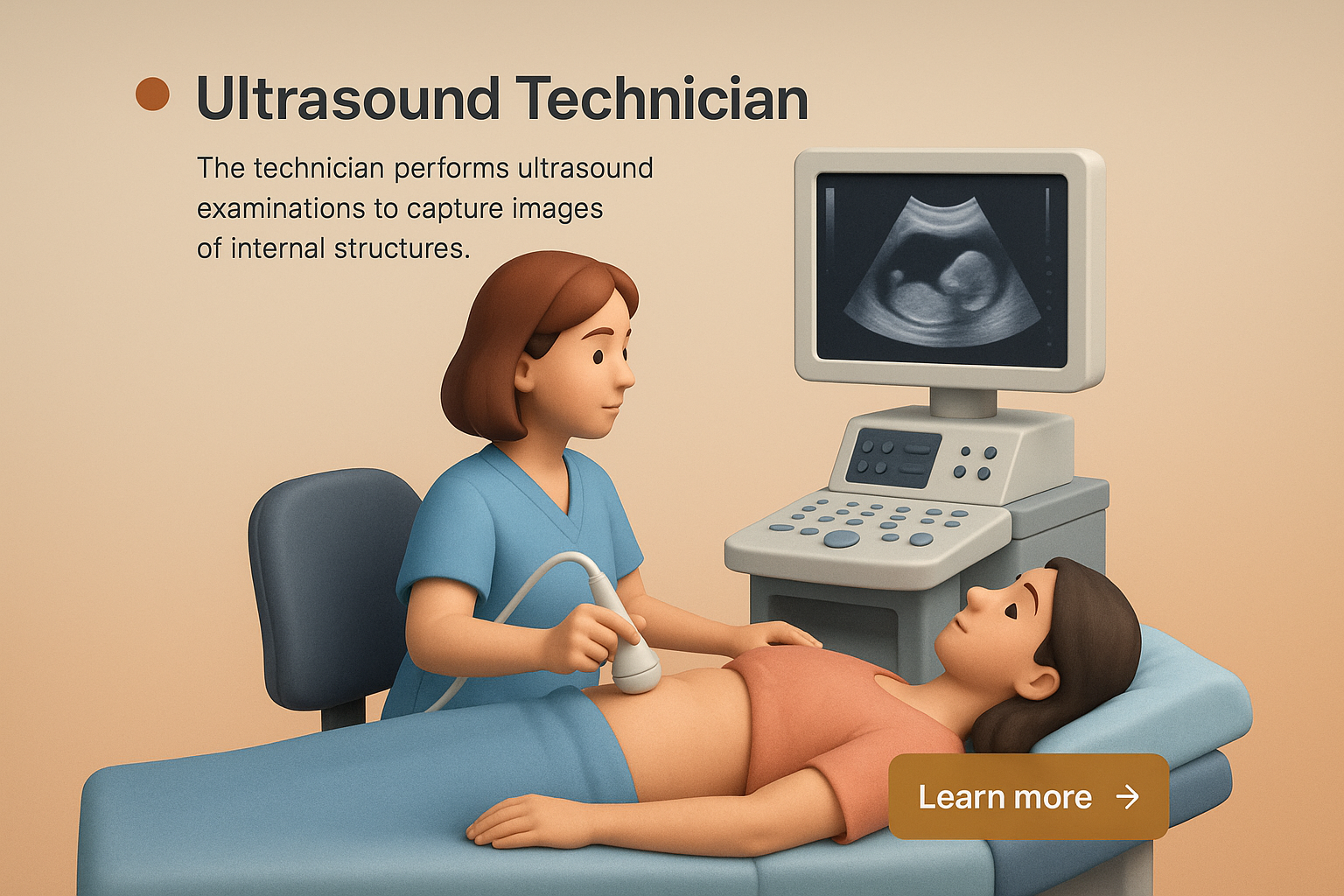 /Collection: /by davooda/Type: PNG/A detailed 3D illustration of an ultrasound technician performing an examination on a patient. The scene includes a machine displaying internal images and a soothing gradient background.