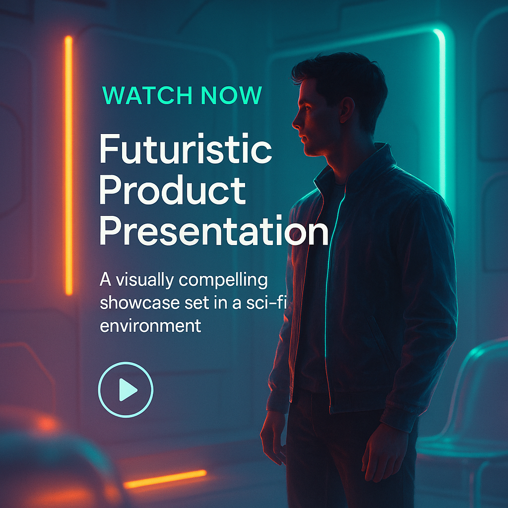 A visually striking promotional graphic featuring a model in a sci-fi environment with neon lighting, ideal for tech and product marketing.