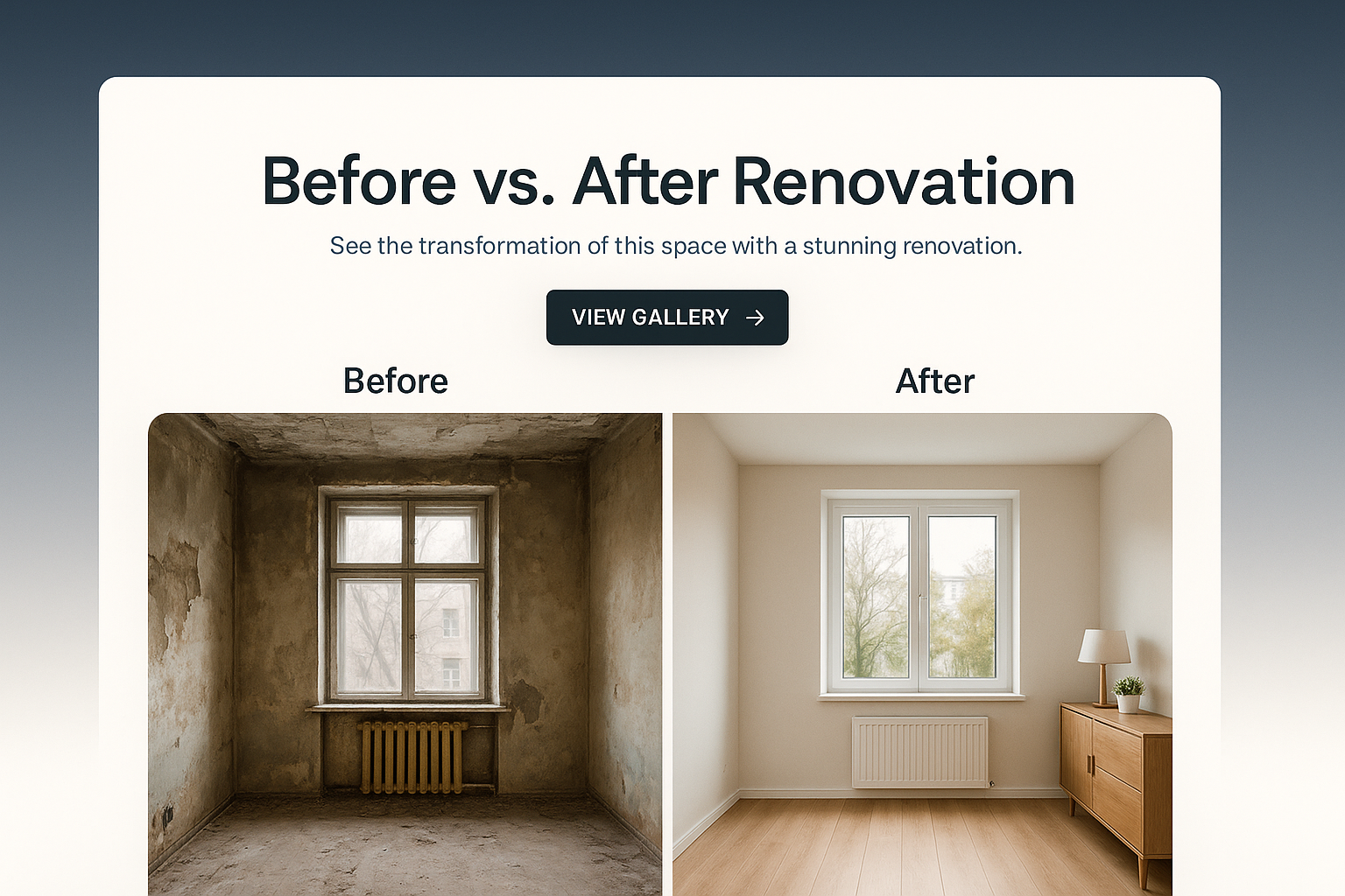 /Collection: /by davooda/Type: PNG/An engaging visual comparison of a room before and after renovation, highlighting the dramatic transformation. The left side shows an old, dilapidated space, while the right displays a modern, inviting interior.