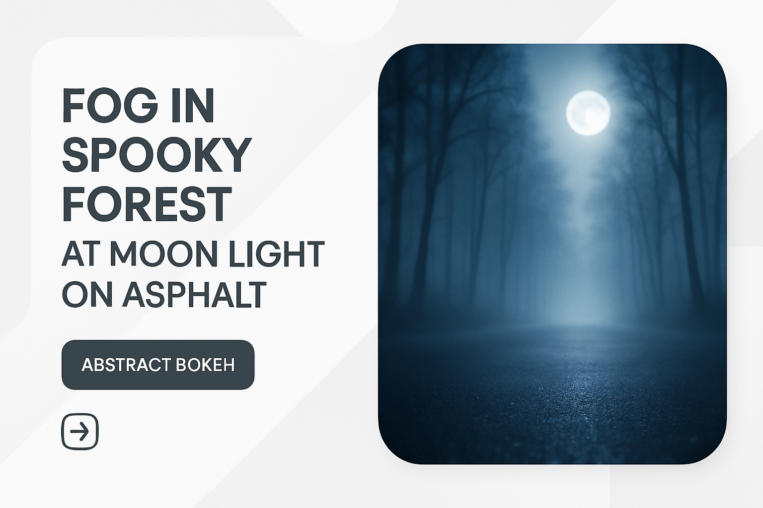 A serene scene of a foggy forest illuminated by moonlight, creating an abstract bokeh effect. The asphalt path leads through the trees, enhancing the mysterious atmosphere.