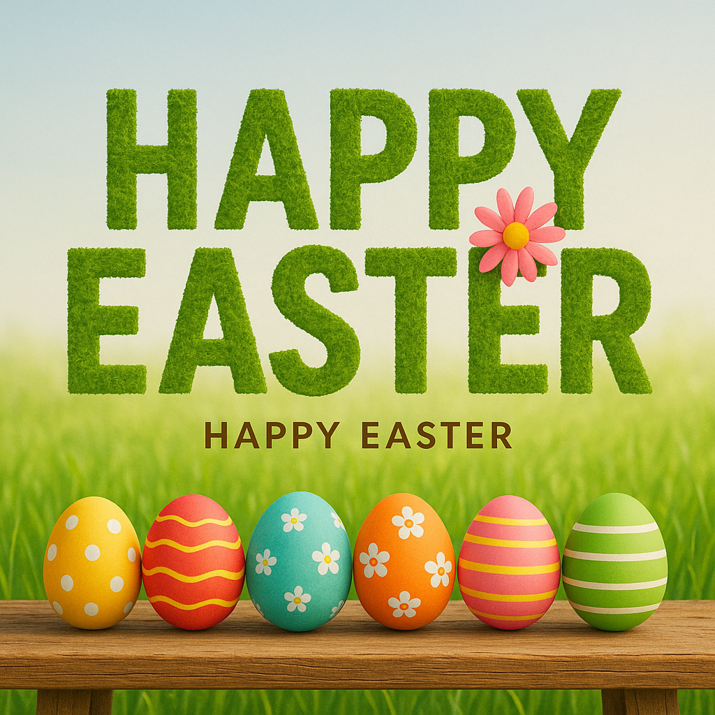 /Collection: /by davooda/Type: PNG/Vibrant Easter-themed graphic featuring the phrase 'Happy Easter' in grassy typography with decorated eggs on a wooden table. Ideal for seasonal greetings and social media posts.