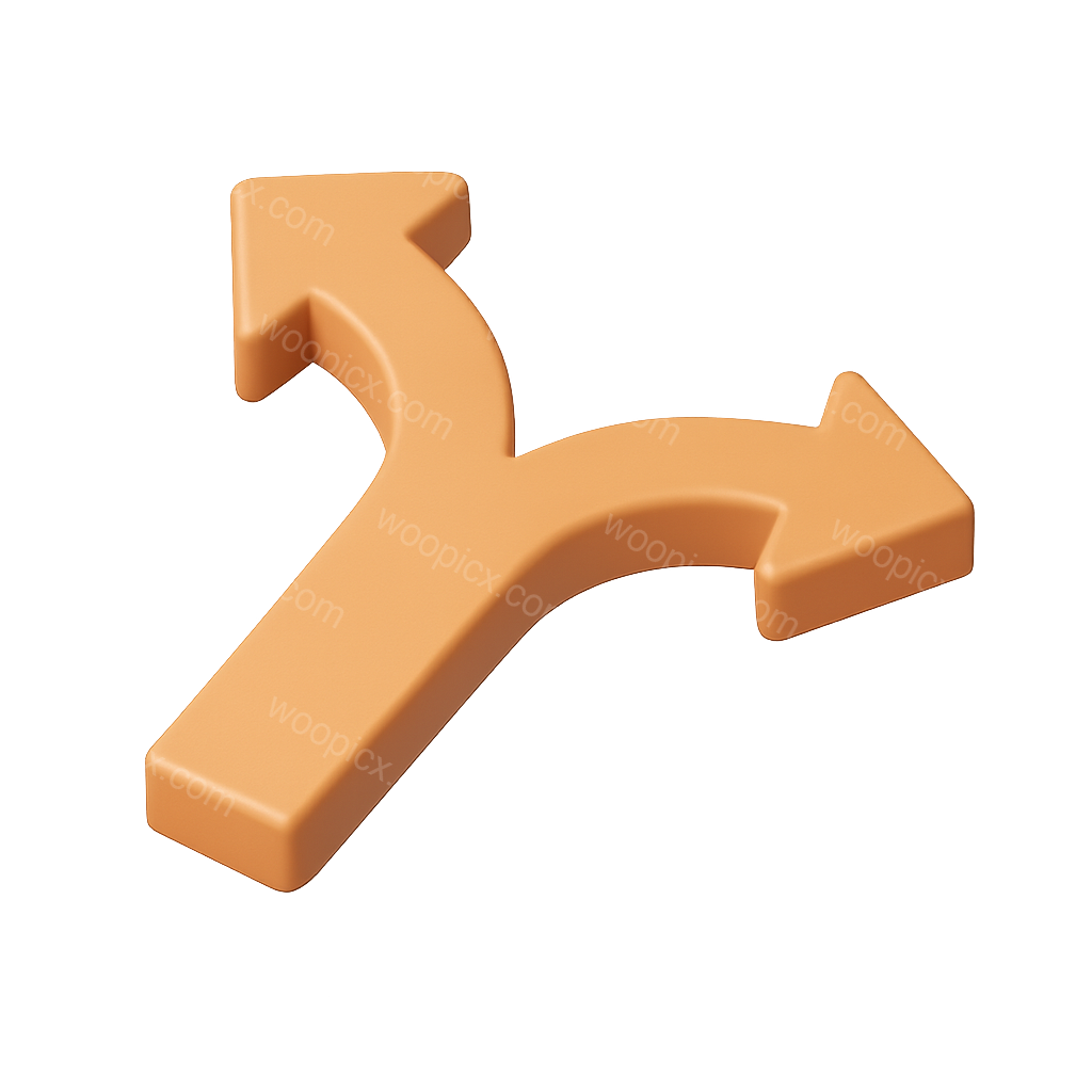 A 3D icon featuring two diverging arrows, designed in a three-quarter view with a glossy finish. The arrows are volumetric and set against a transparent background.