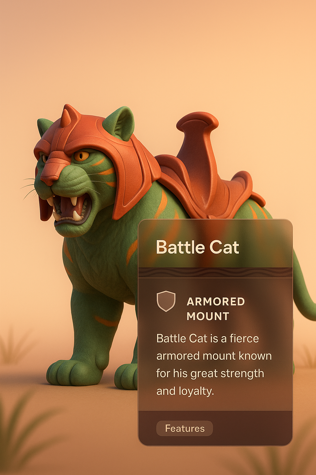 /Collection: /by davooda/Type: PNG/A vibrant 3D illustration of a fierce Battle Cat, featuring a detailed design. The cat is positioned against a smooth gradient background with an integrated informational panel highlighting its traits.