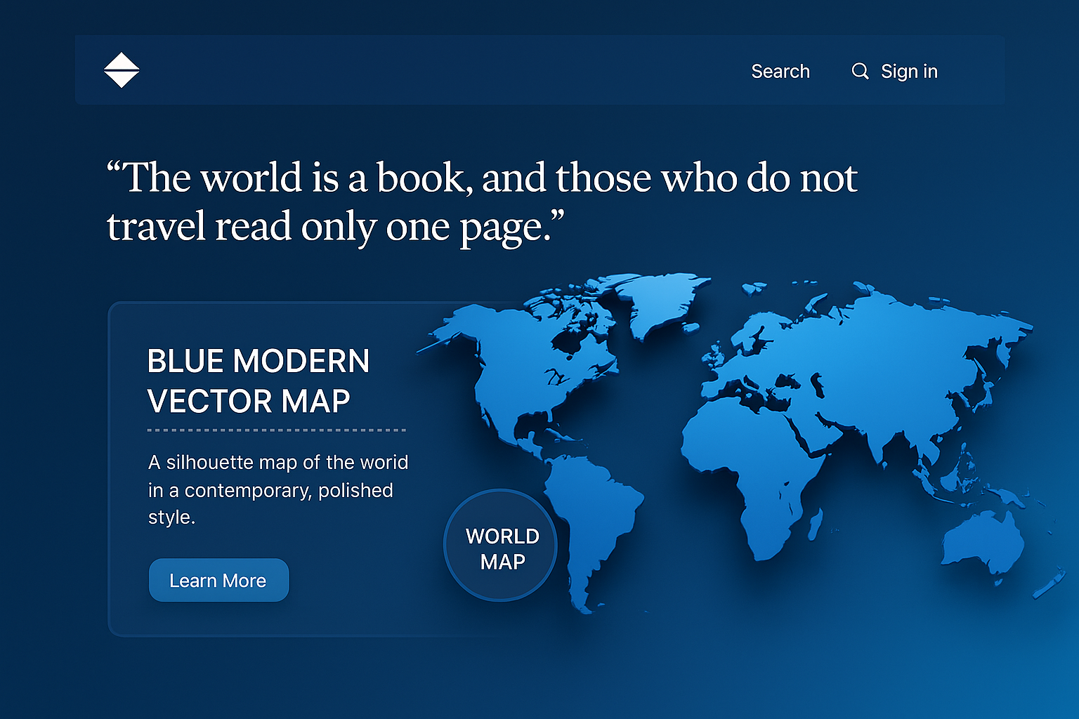 A sleek landing page featuring a blue modern vector map and a quote about travel. Includes a search menu and sign-in options, with a polished layout.