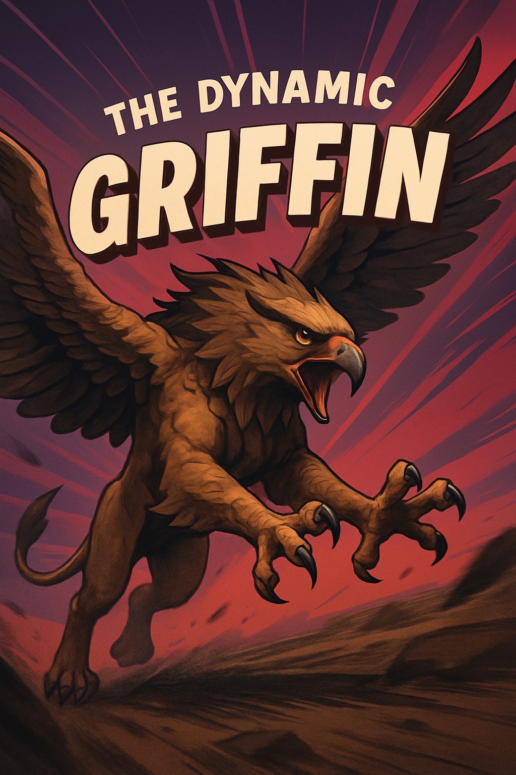 /Collection: /by davooda/Type: PNG/A fierce depiction of a griffin with powerful wings and sharp claws, set against a vibrant gradient background. The title 'THE DYNAMIC GRIFFIN' stands out with a bold design.