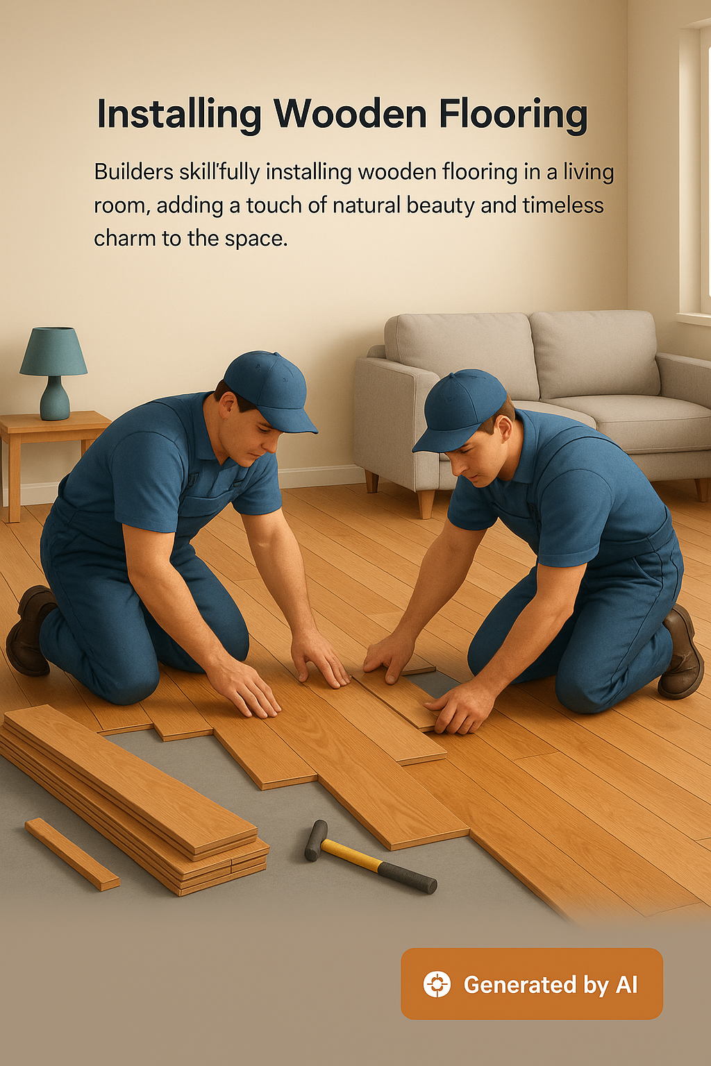 /Collection: /by davooda/Type: PNG/Two builders are meticulously laying wooden flooring in a cozy living room, enhancing the space's natural beauty and charm. The scene is depicted in a realistic style.