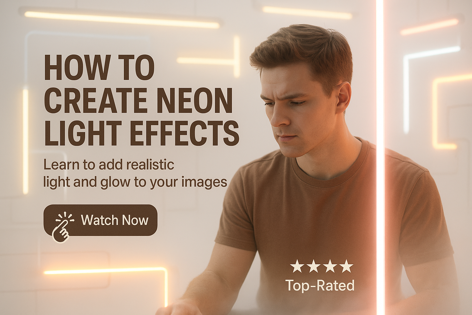 Promotional graphic for a tutorial on creating neon light effects, featuring a modern design with clean lines and a focus on the subject engaged in learning. Ideal for digital courses or creative content marketing.