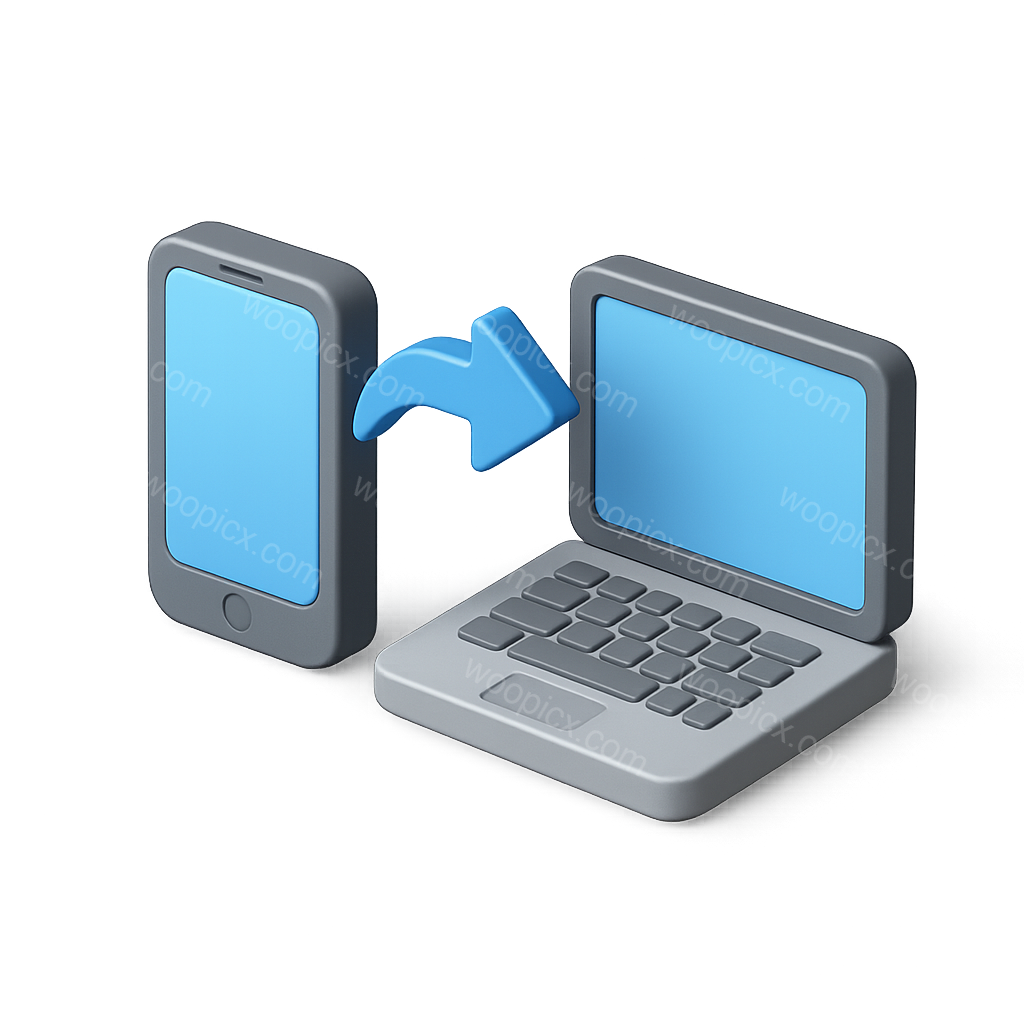 /Premium/Collection: /by davooda/Type: PNG/A visually appealing 3D icon depicting data transfer between a smartphone and a laptop. The design features a blue arrow signaling the transfer, set against a subtle gray background.