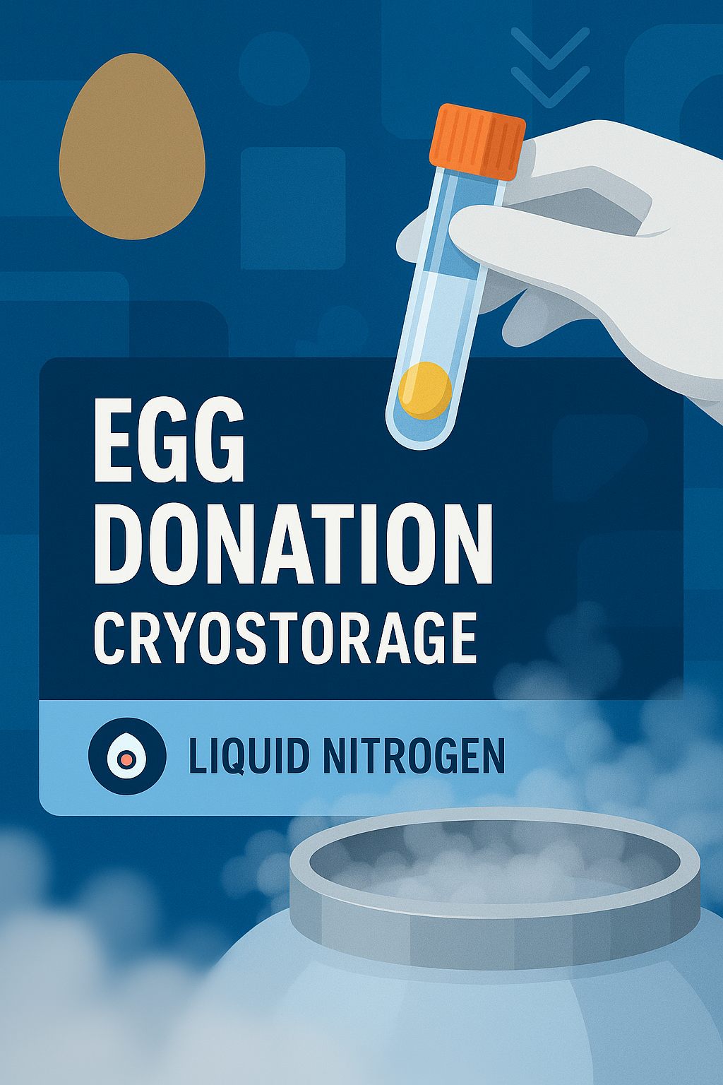 /Collection: /by davooda/Type: PNG/A modern and educational graphic illustrating the process of egg donation and cryostorage, featuring a test tube and liquid nitrogen imagery ideal for healthcare communications.