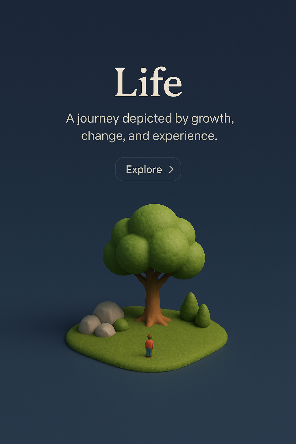 /Collection: /by davooda/Type: PNG/A 3D illustration depicting a small figure in a natural setting, surrounded by a large tree and rocks, emphasizing themes of growth and experience against a dark gradient background.