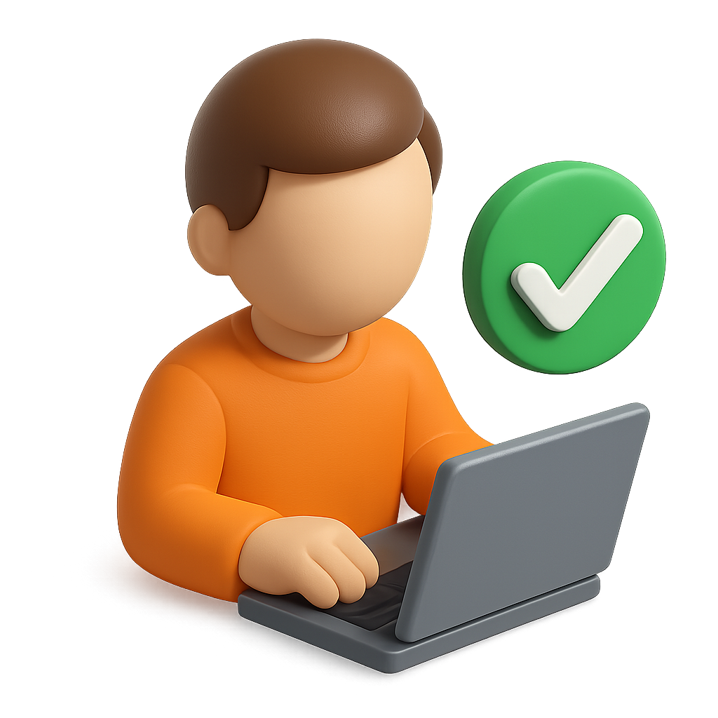 A 3D icon depicting a person working on a laptop, accompanied by a green checkmark. The design features a transparent background and showcases a three-quarter view for a volumetric effect.