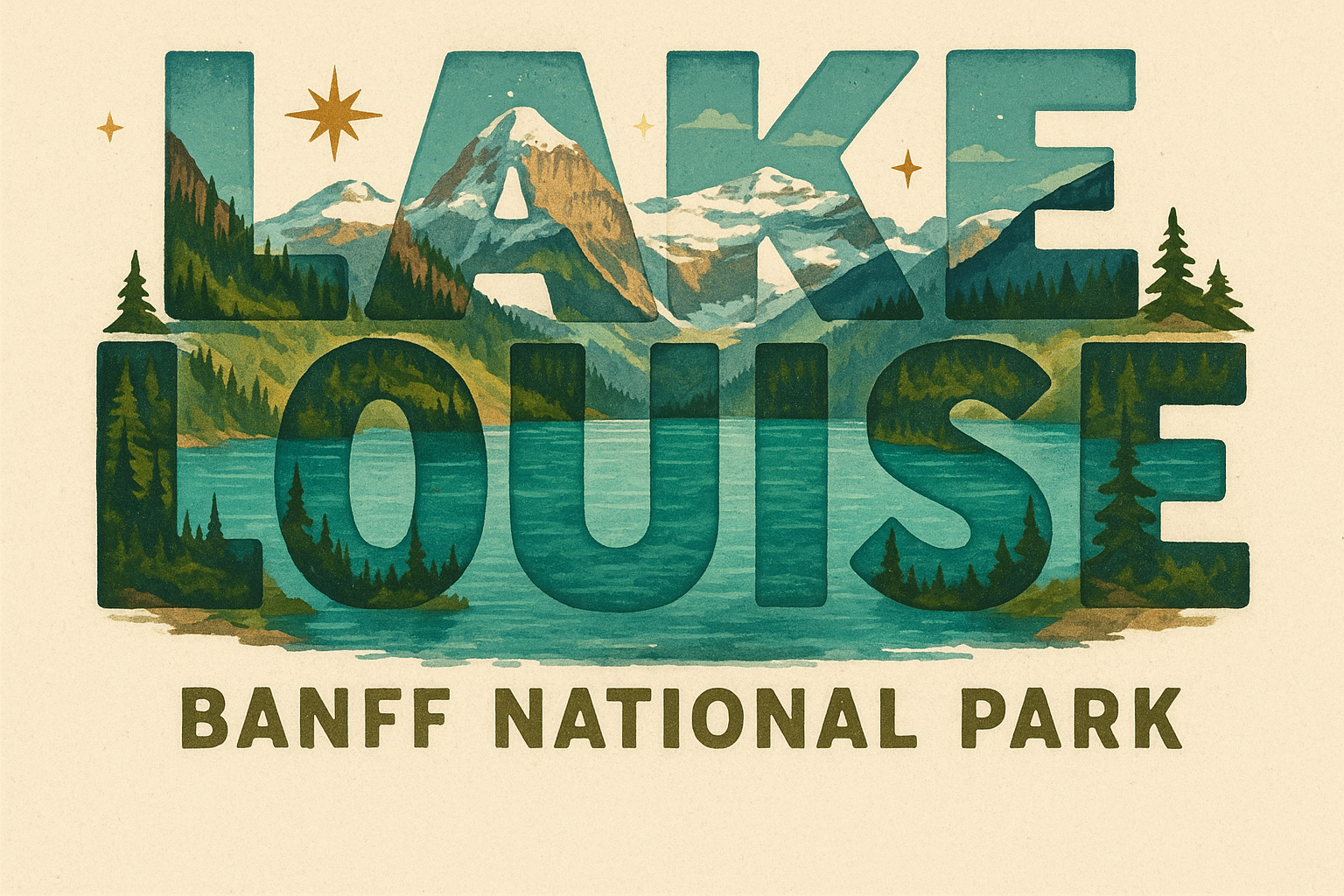 /Collection: /by davooda/Type: PNG/A vibrant illustrated graphic showcasing Lake Louise in Banff National Park, featuring mountains, a lake, and dense forests, ideal for travel promotion and nature enthusiasts.