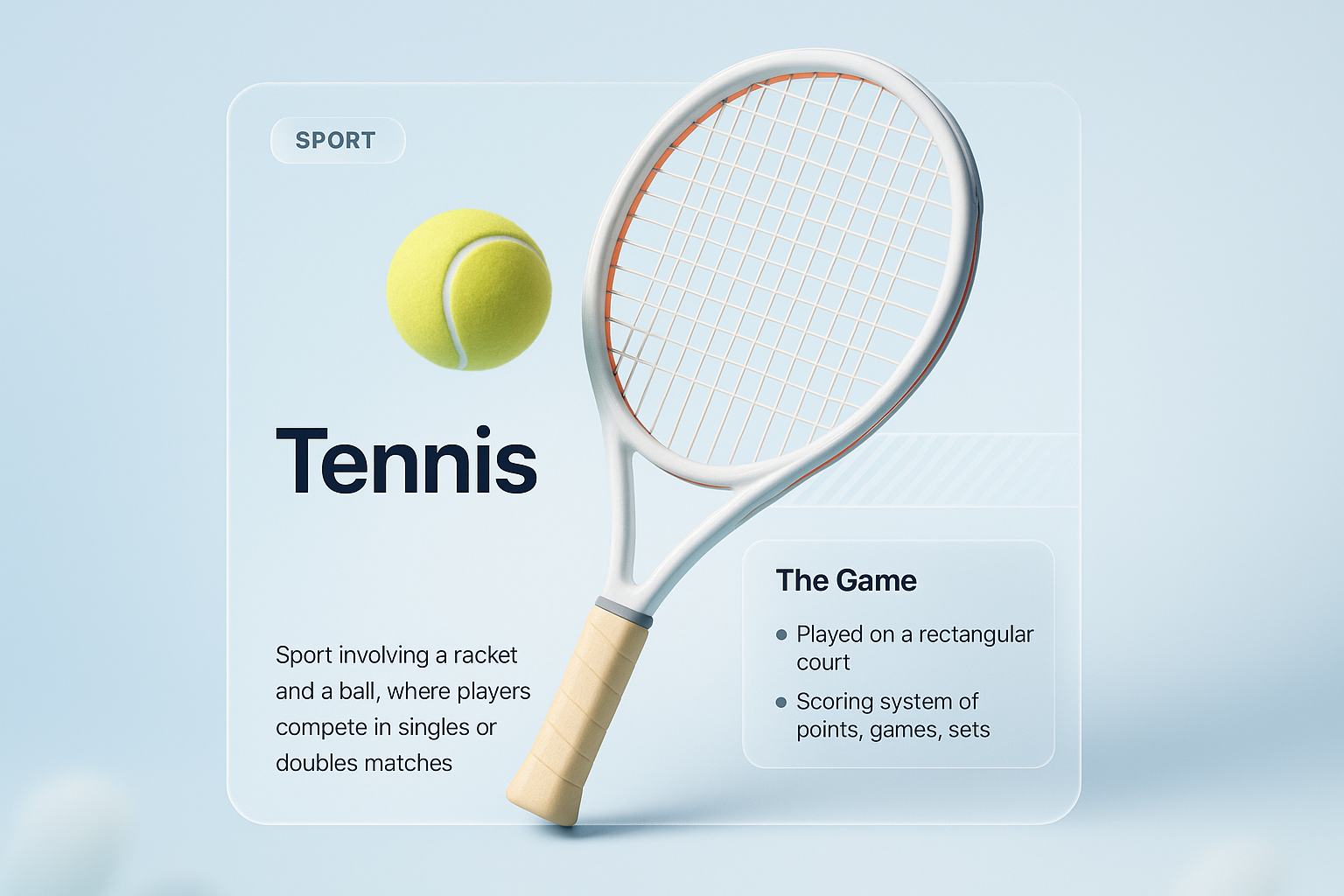 A visually appealing 3D design featuring a tennis racket and ball, integrated with informative text blocks. The background transitions smoothly, emphasizing the sport's essence.