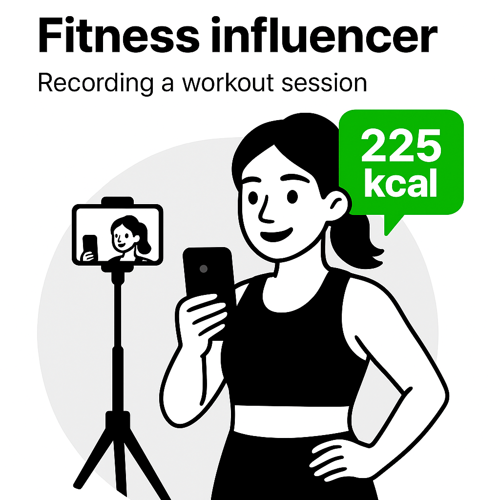/Collection: /by davooda/Type: PNG/Stylized illustration representing a fitness influencer recording a workout session. The image features a character with a smartphone and a camera setup, ideal for social media or fitness-related content.