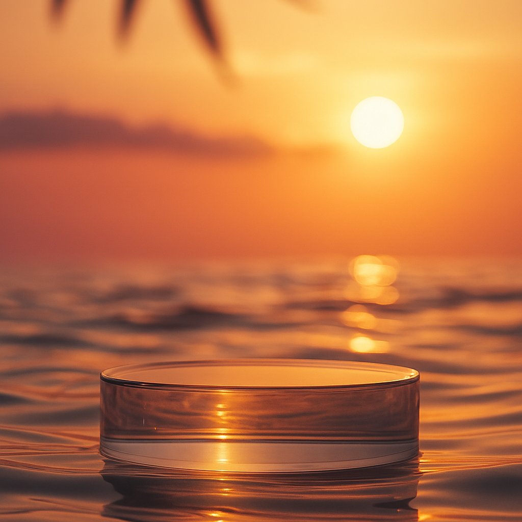 /Collection: /by davooda/Type: PNG/A tranquil image capturing a sunset over calm waters, featuring a circular reflective surface that mirrors the vibrant colors of the sky. Ideal for relaxation-themed content.