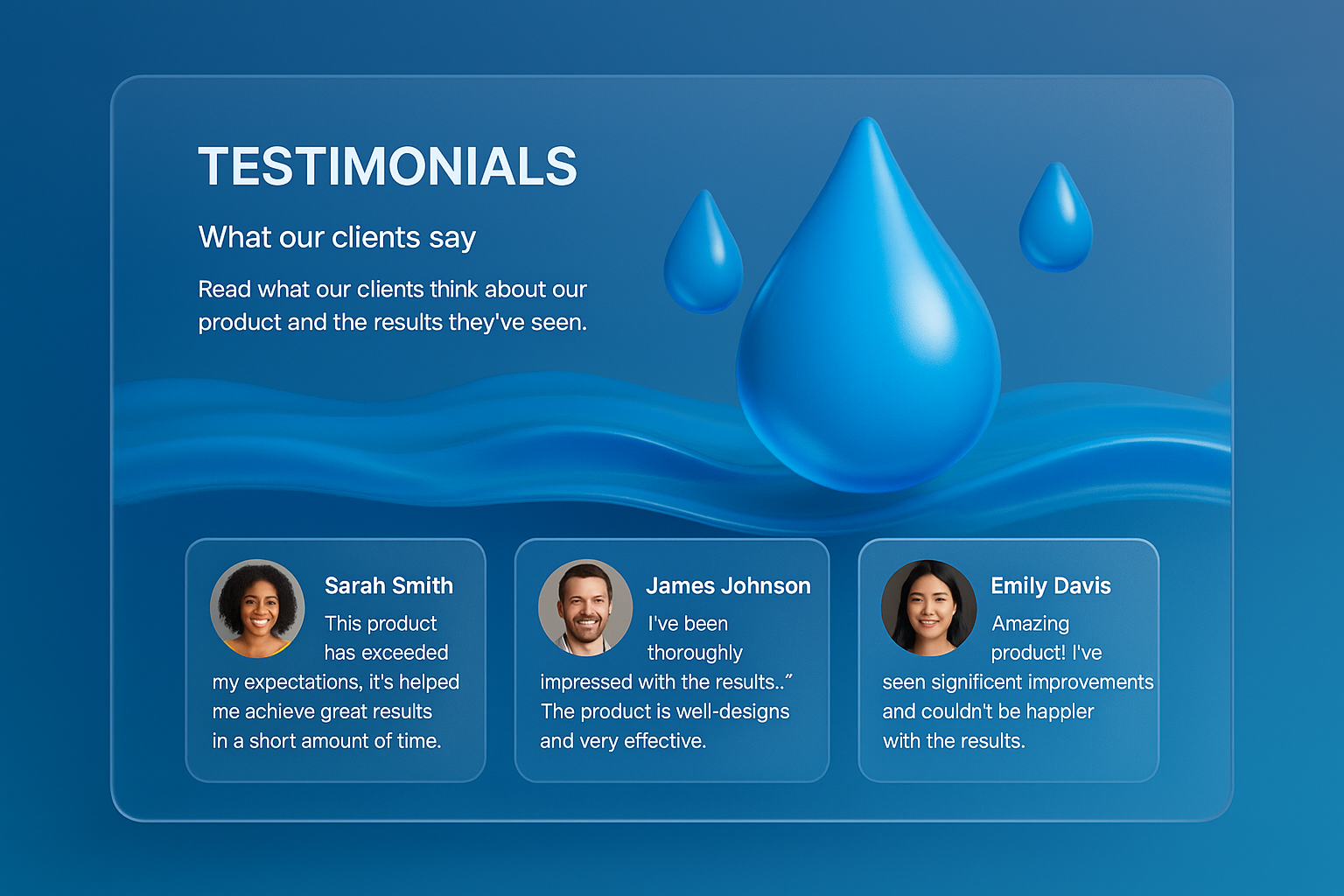 /Collection: /by davooda/Type: PNG/This image showcases a testimonials section featuring three client reviews, each with a circular photo, name, and text. The background includes blue water drop illustrations.