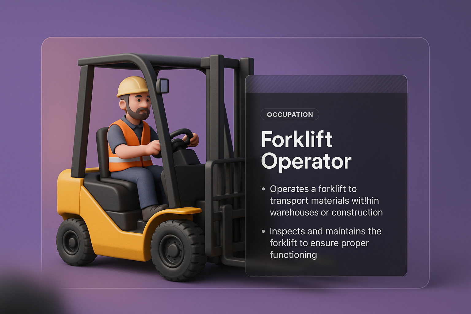 A vibrant 3D illustration showcasing a forklift operator at work, featuring a sleek design with layered elements and a modern aesthetic.
