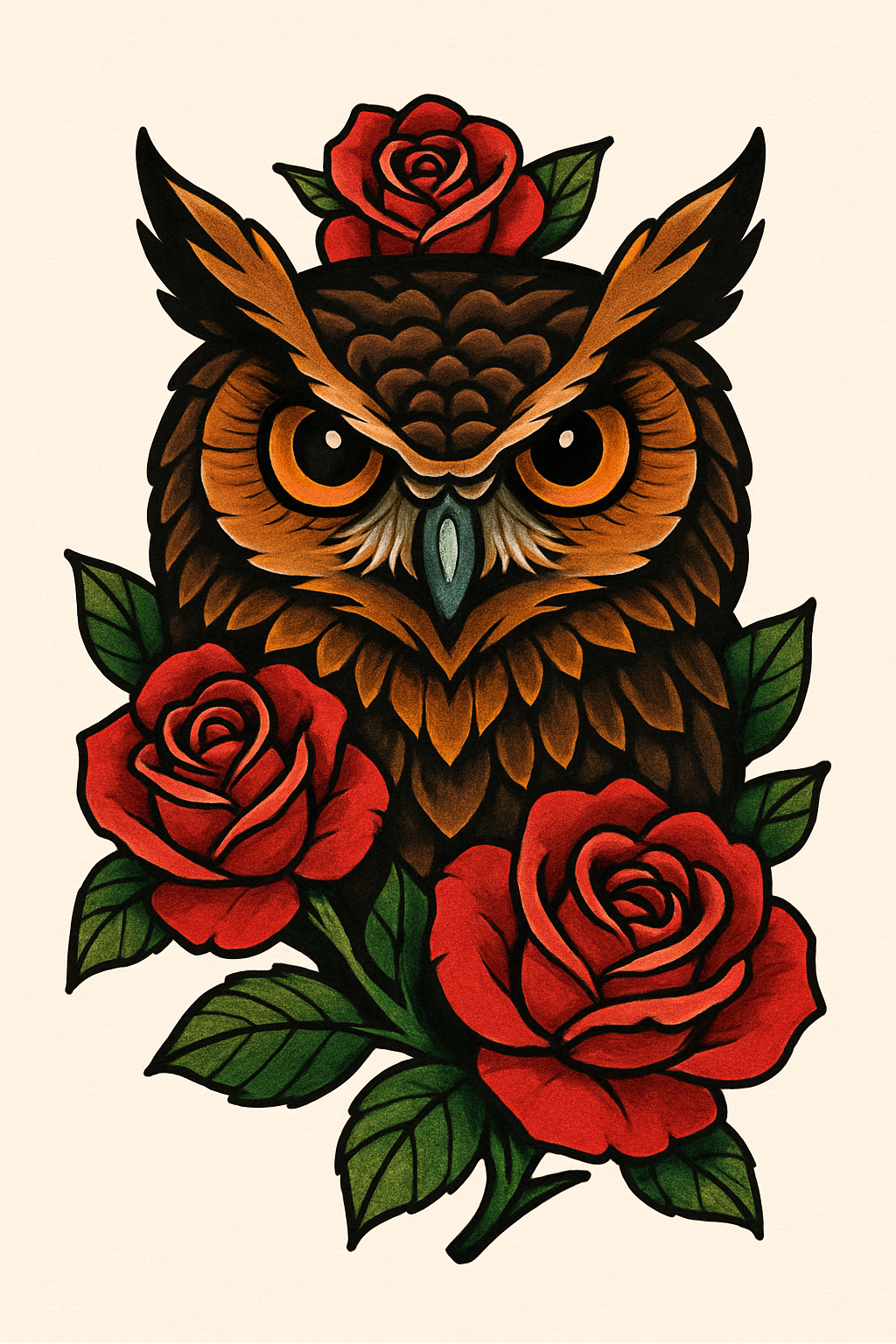 Vibrant tattoo design featuring a fierce owl surrounded by bold red roses. The illustration uses a traditional style with intricate details, suitable for body art or decorative prints.