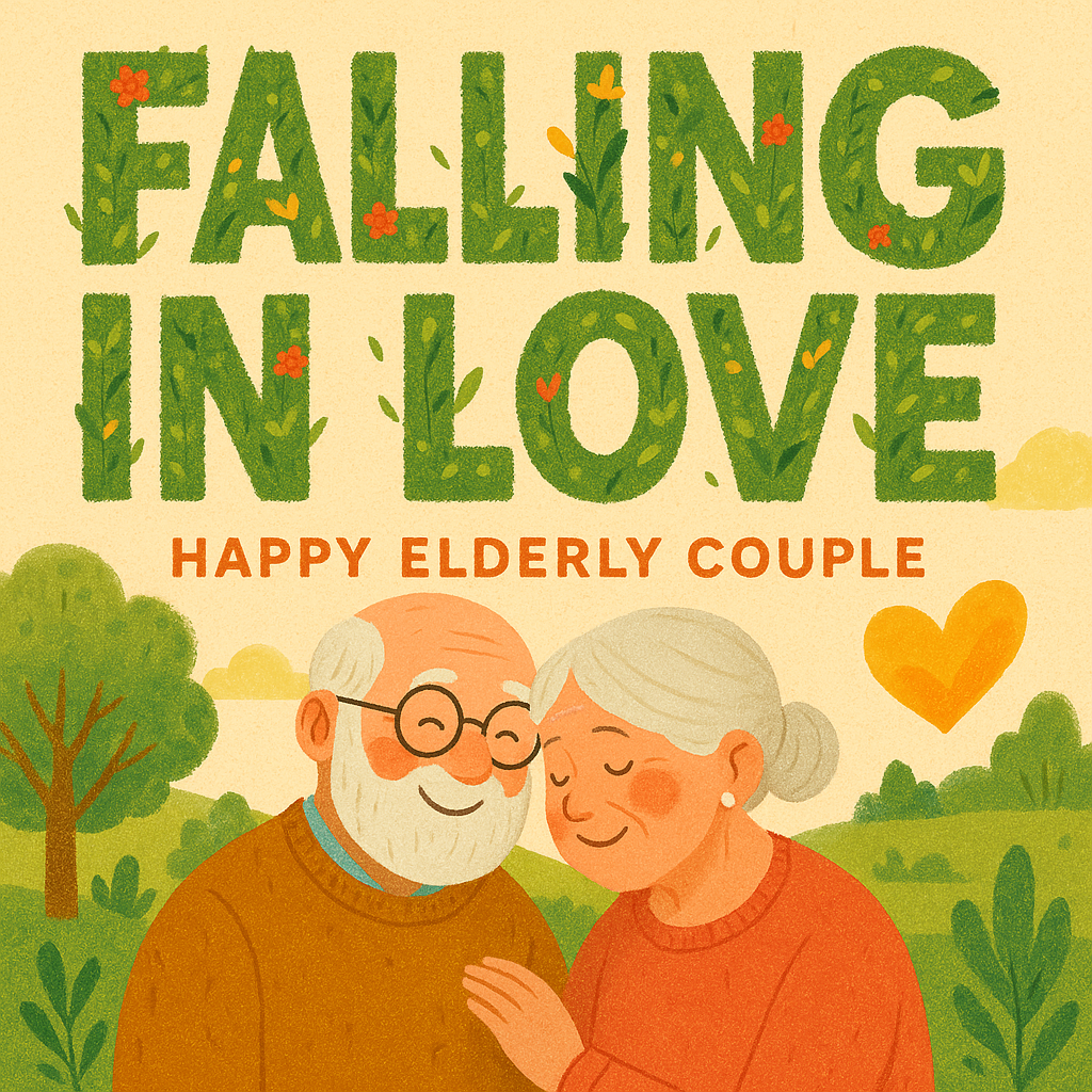 A heartwarming graphic depicting a happy elderly couple surrounded by nature, perfect for themes of love and companionship in promotional materials or social media.