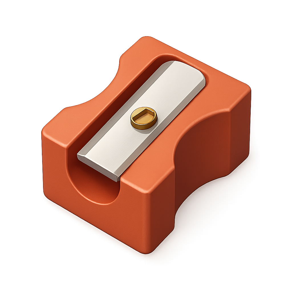 /Collection: /by davooda/Type: PNG/A 3D representation of a sharpener in an isometric view, featuring a vibrant orange body and a metallic blade with a golden screw, set against a smooth gradient background.