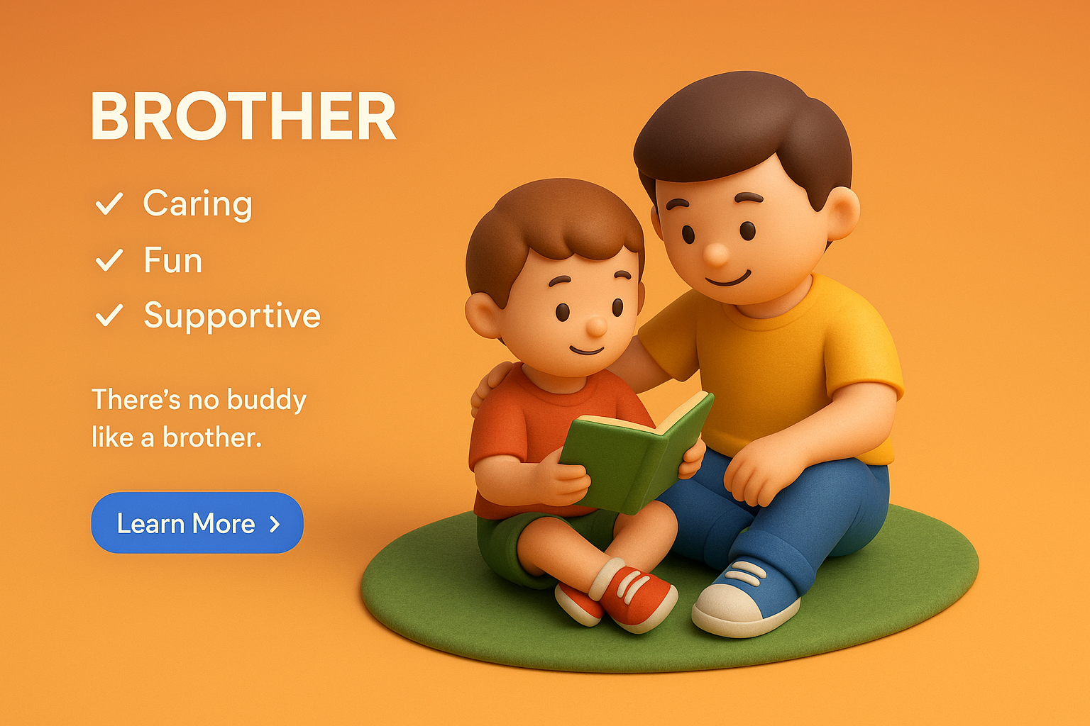 A vibrant 3D scene depicting a brother reading with his younger sibling. The warm background complements the playful characters, emphasizing care and support.