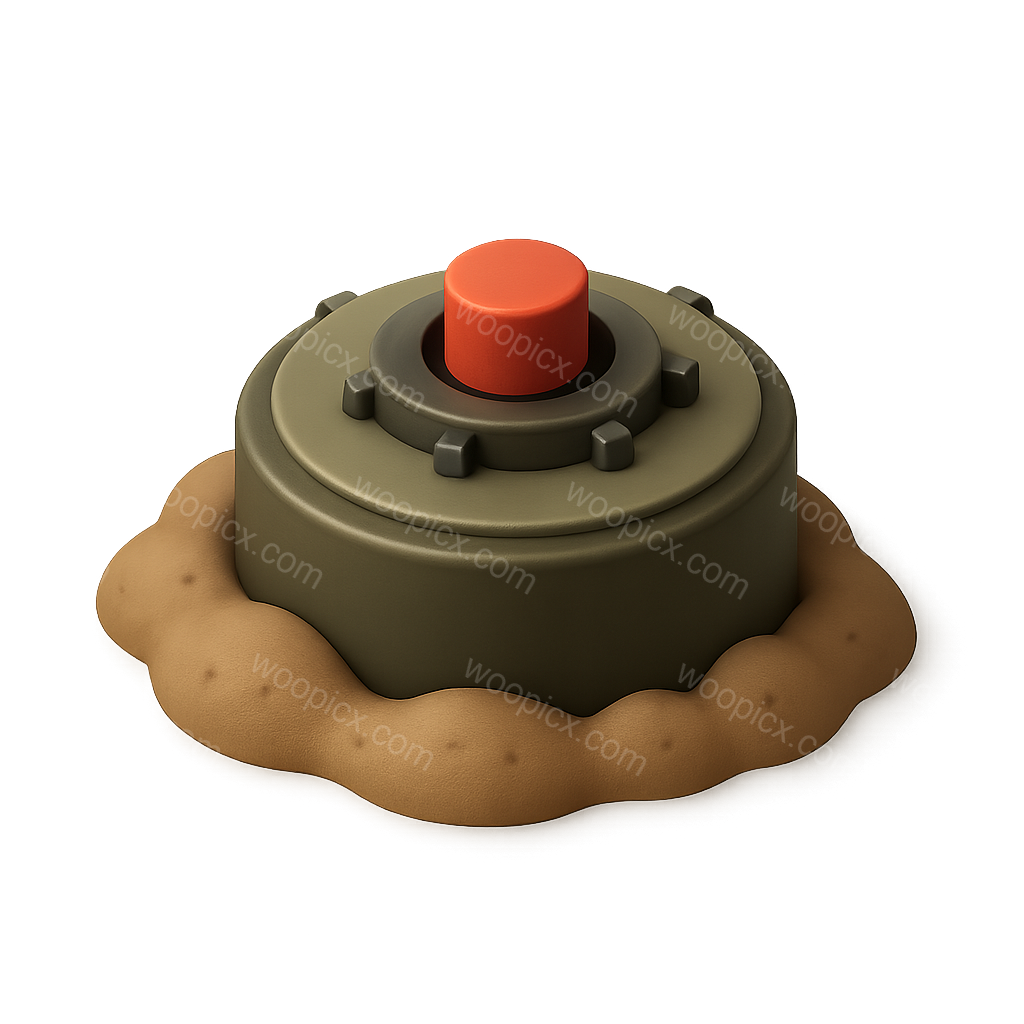 A detailed 3D representation of a landmine featuring a central red button and a textured base. The design emphasizes realism with sandy textures around the base.