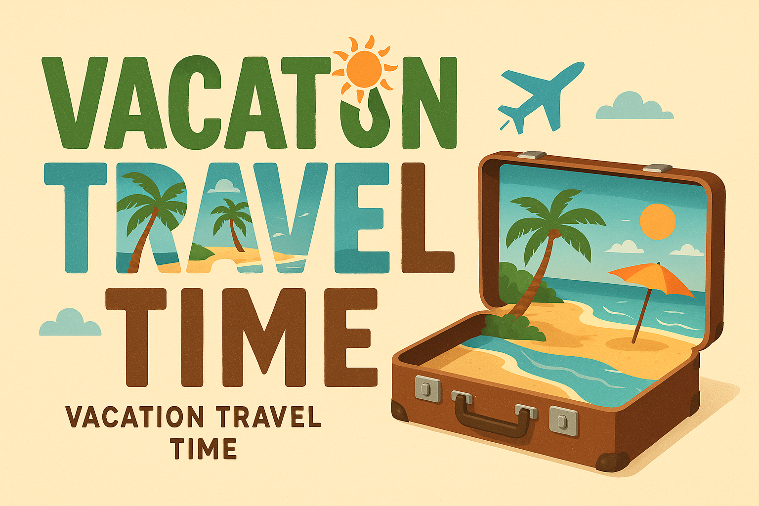 Colorful Vacation Travel Graphic Featuring Suitcase and Beach Scene