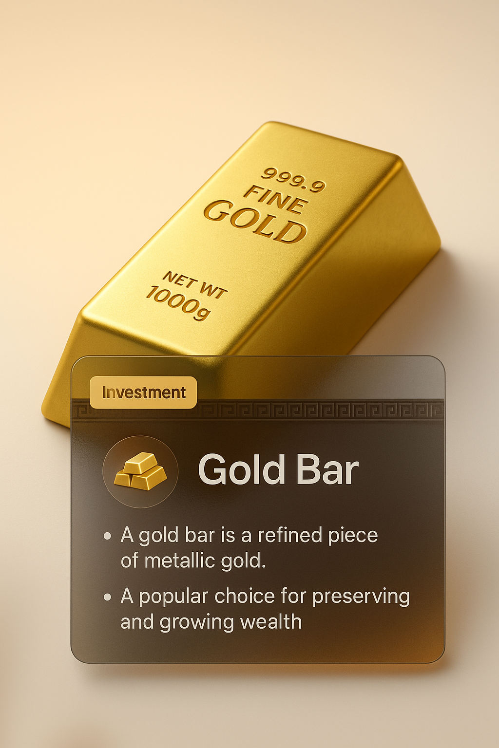 A detailed 3D illustration of a gold bar on a smooth gradient background, featuring an informative overlay that highlights its investment value. The design is cohesive and visually appealing.