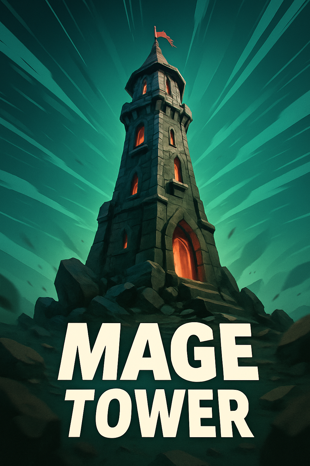 /Collection: /by davooda/Type: PNG/A striking illustration of a mage tower, featuring a dynamic perspective and bold typography. The tower stands against a gradient background, with vibrant colors and an engaging composition.