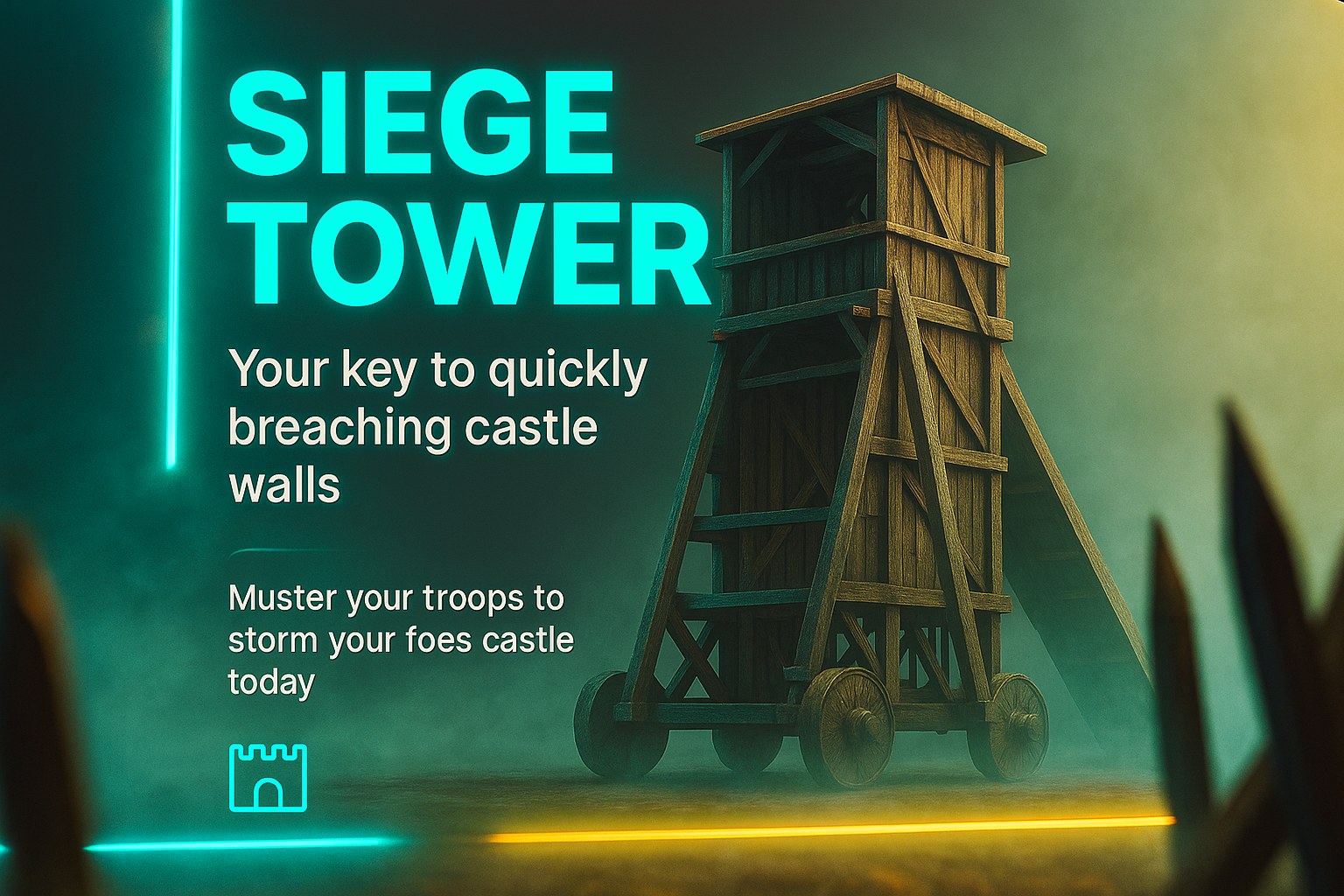 /Collection: /by davooda/Type: PNG/A professional LinkedIn carousel slide featuring a realistic siege tower, emphasizing quick castle breaching. The design incorporates neon accents and a layered composition with engaging text.