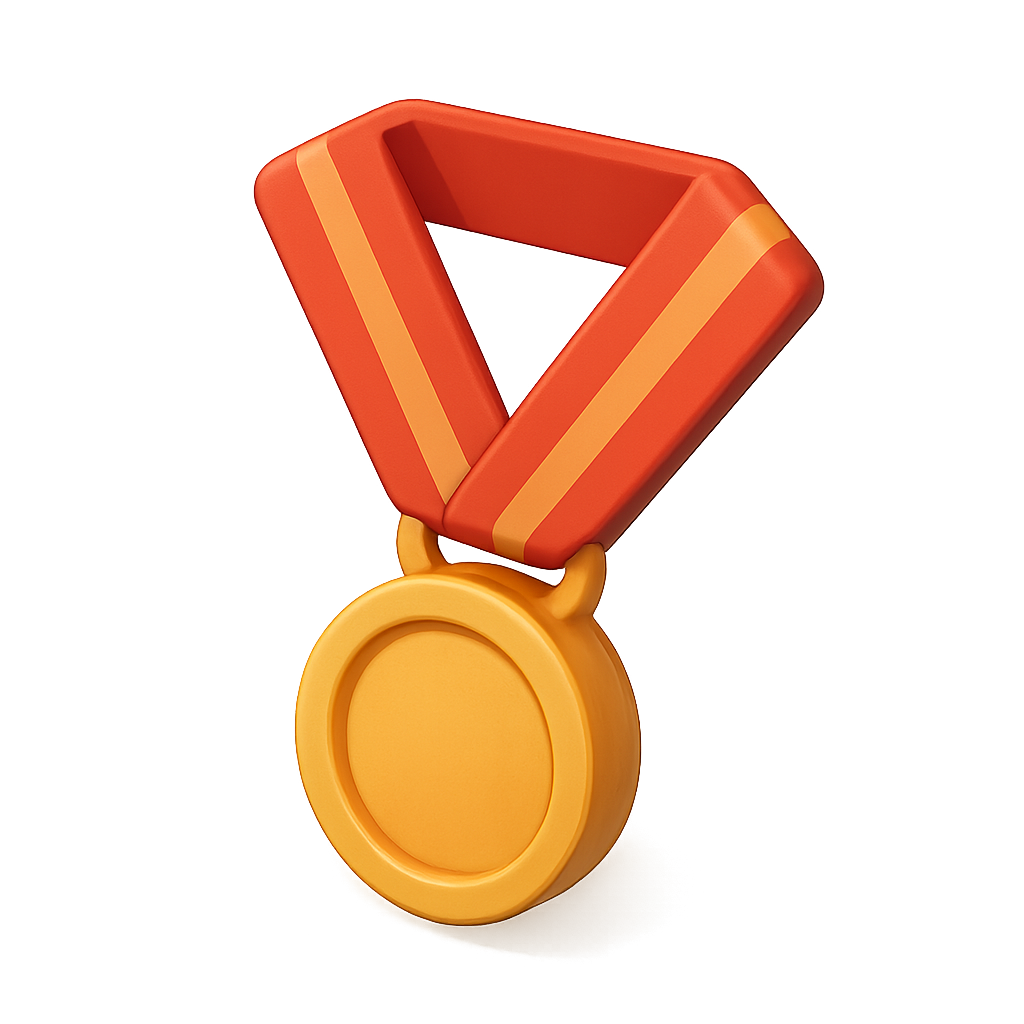 A visually appealing 3D medal icon featuring a red and orange ribbon, designed with a transparent background and a three-quarter isometric view, giving it a volumetric feel.