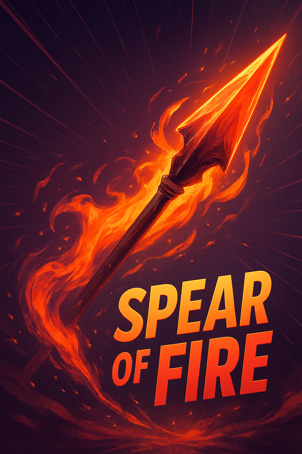 /Collection: /by davooda/Type: PNG/A visually striking illustration of a fiery spear emanating dynamic flames, set against a smooth gradient background. The bold typography emphasizes the title 'Spear of Fire'.
