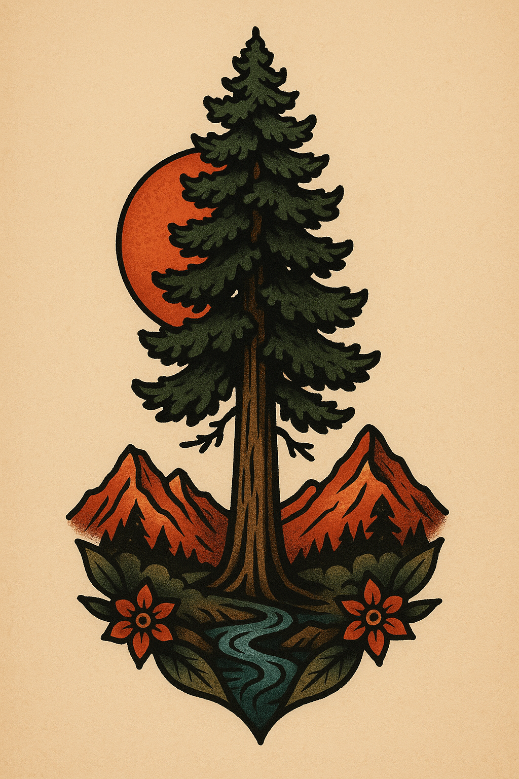 /Collection: /by davooda/Type: PNG/This image represents a stylized nature scene featuring a tall tree, mountains, and flowers. It uses bold colors and outlines, ideal for prints or outdoor-themed designs.