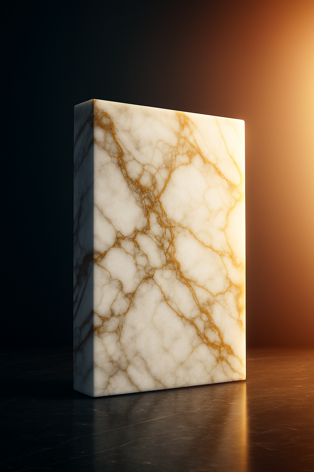 A stunning slab of white marble featuring intricate gold veining, illuminated by a soft gradient backlight. The smooth surface contrasts beautifully with a dark background, creating an elegant atmosphere.