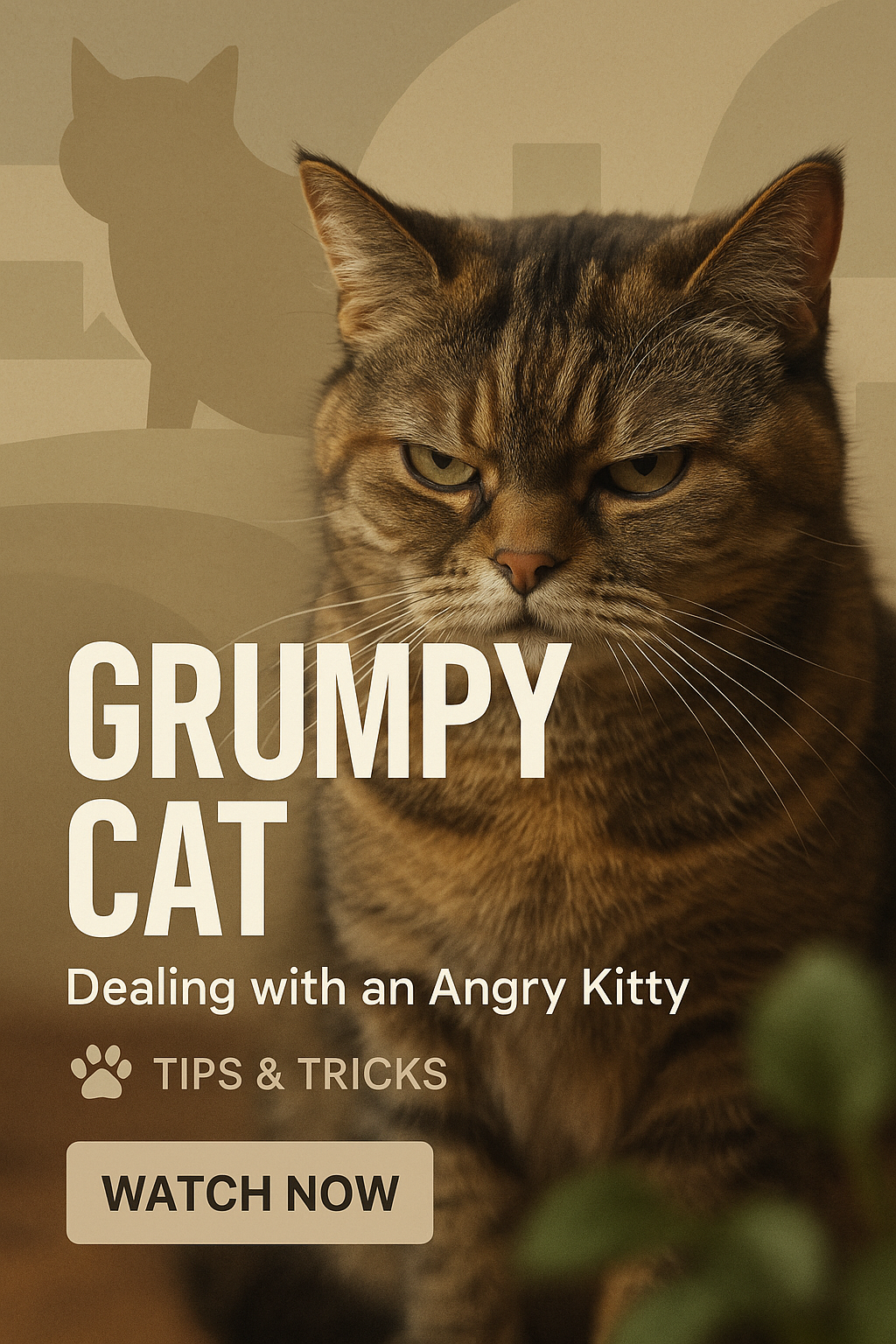 A visually appealing tutorial graphic showcasing a grumpy cat with a light background. Ideal for pet care tips and tricks, targeting cat owners seeking advice.